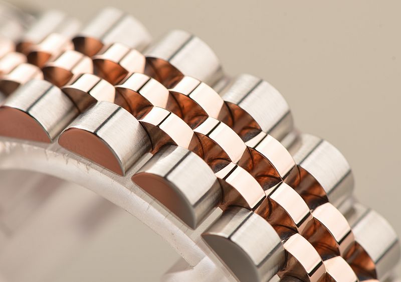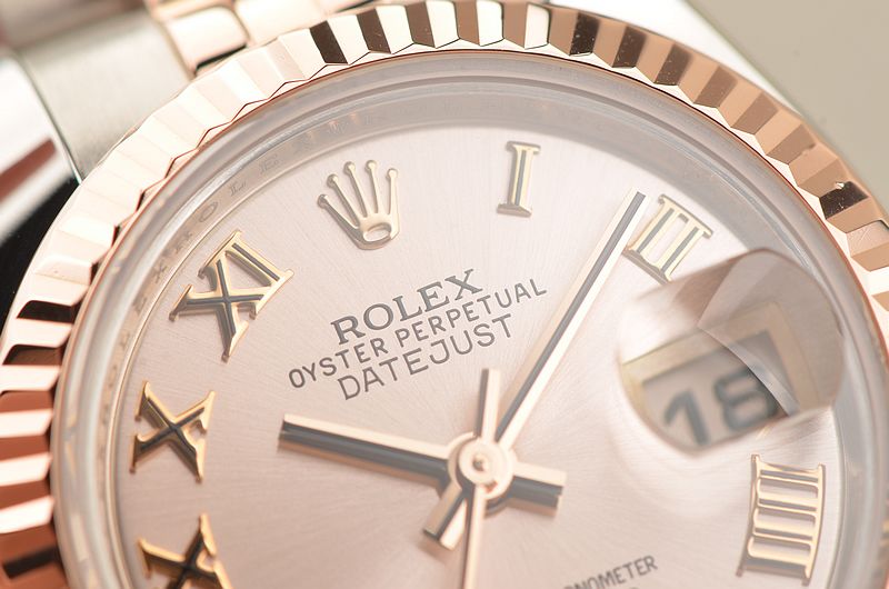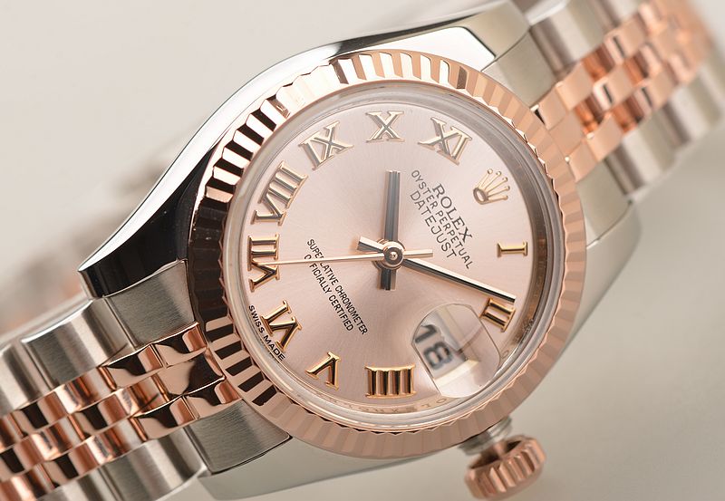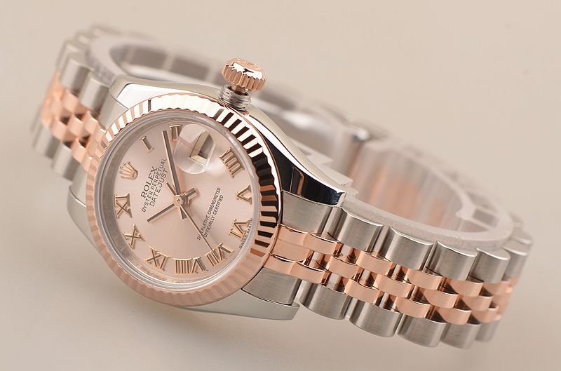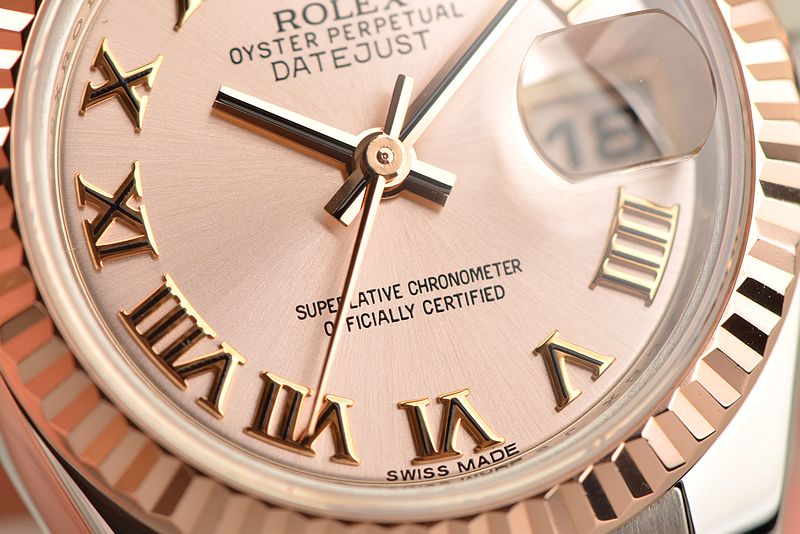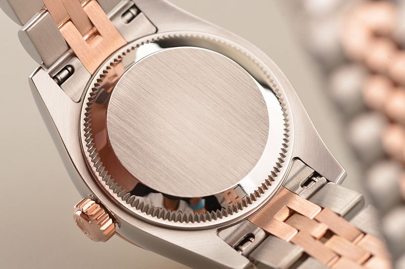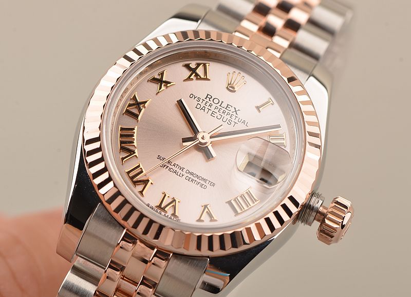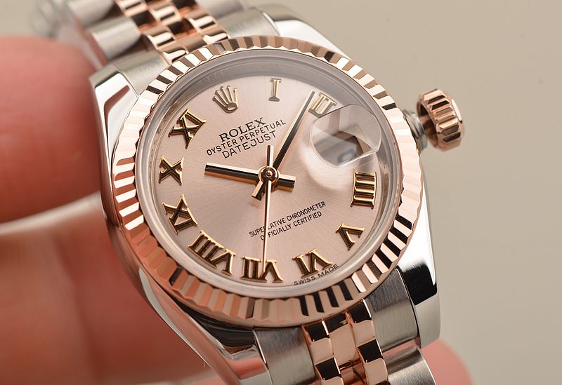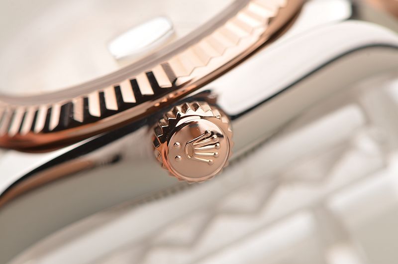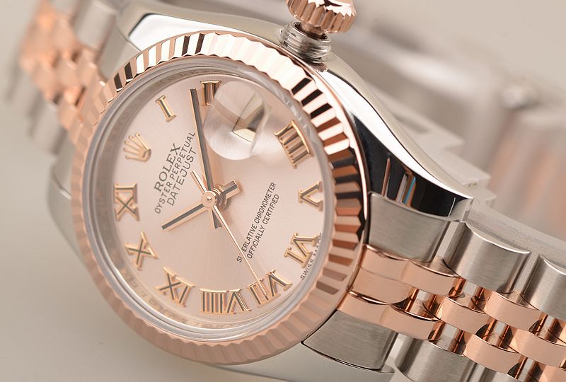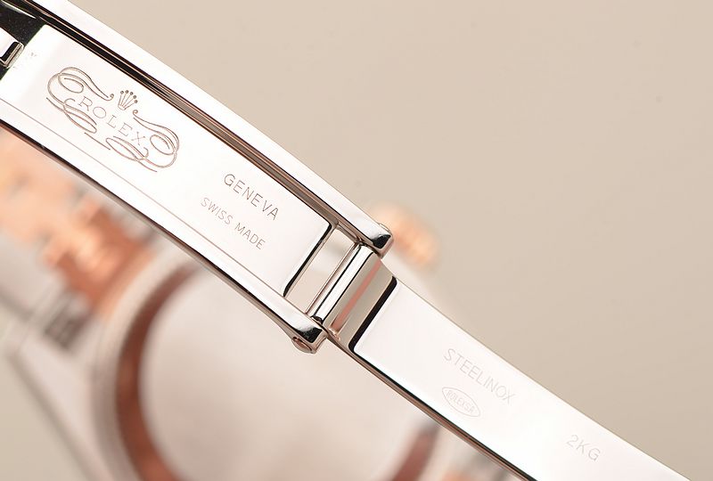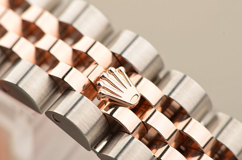 904L精钢及18K玫瑰金表壳及链带,折叠式表扣。18K玫瑰金三角坑纹表圈。蓝宝石水晶镜面,立体粉色表盘,玫瑰金黑玛瑙刻度及指针,3点位放大镜日历视窗,旋入式防水表冠。口径26MM*11MM。防水100M。