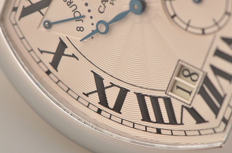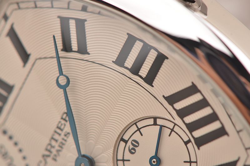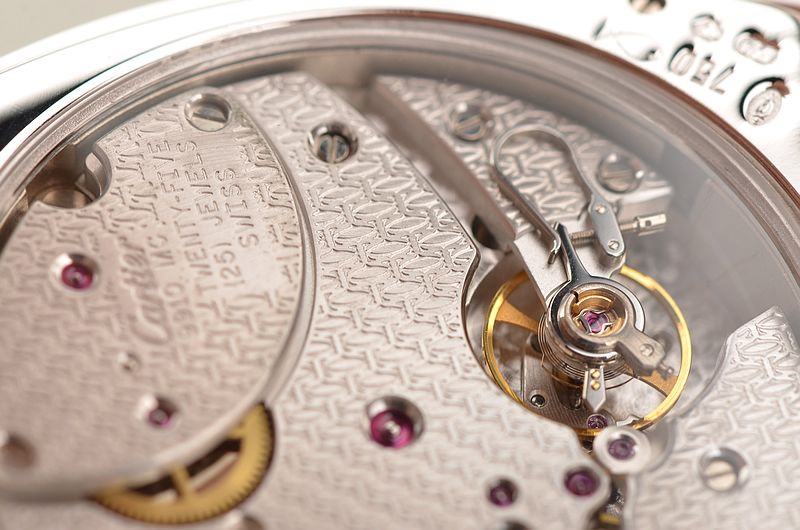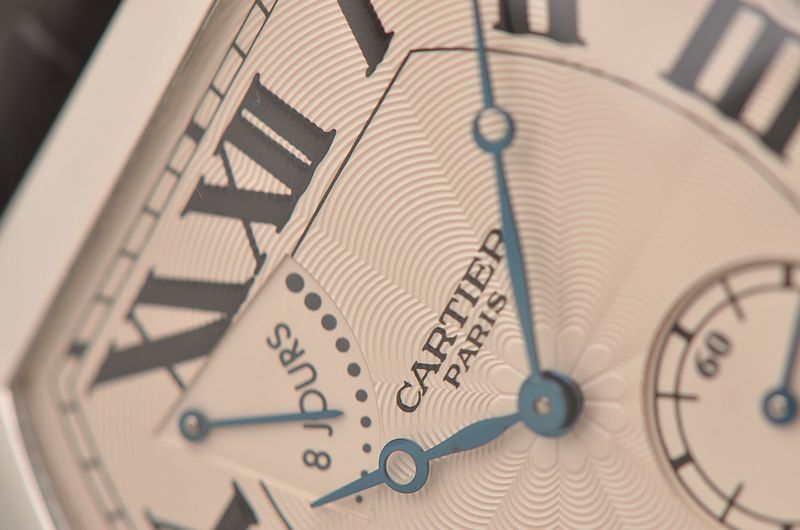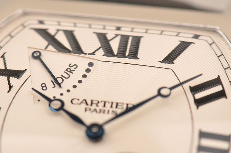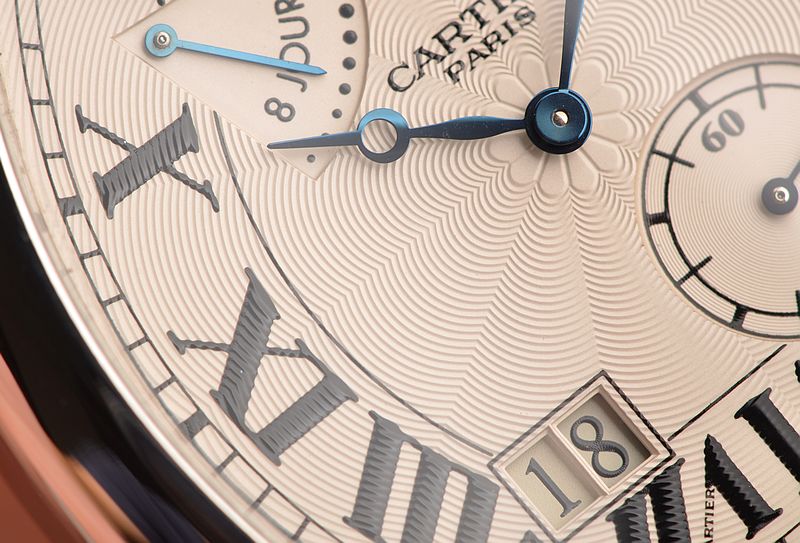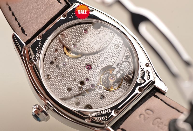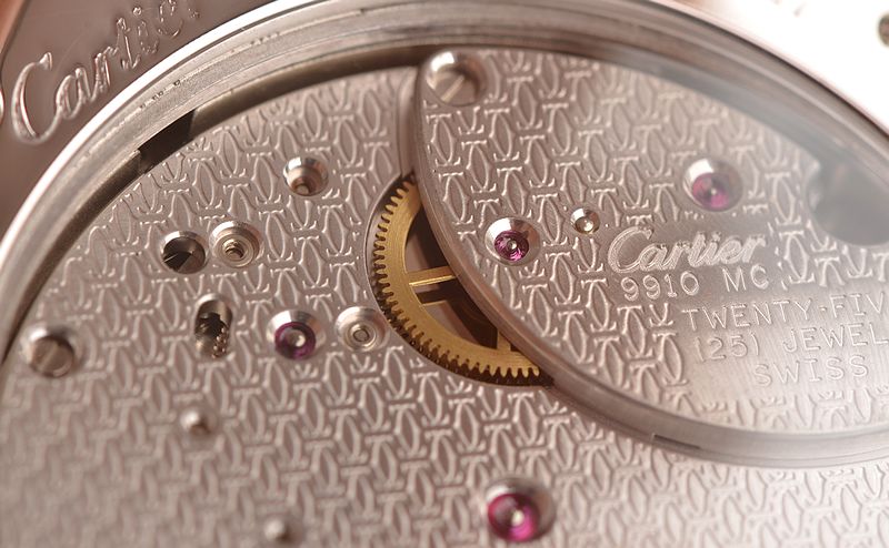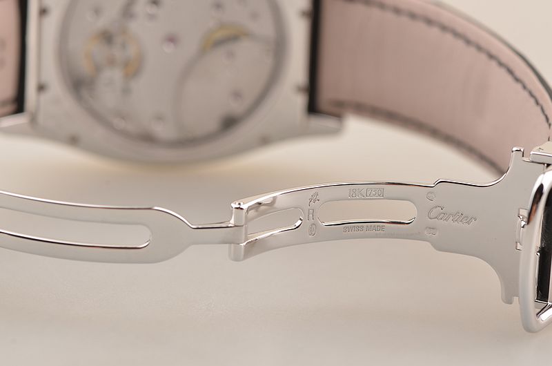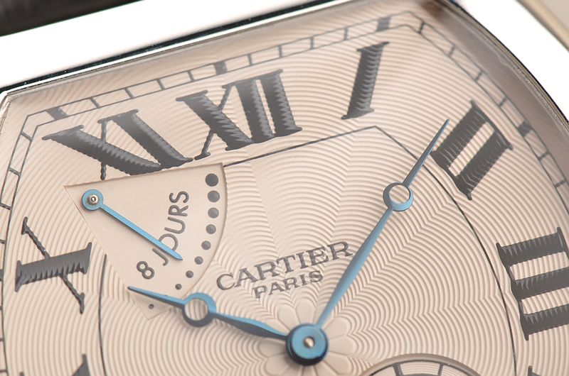 卡地亚顶级巴黎工作室机芯,CAL.9910MC型机芯,手上链,极其精致人手雕花机芯,倒角抛光修饰,鹅颈微调,25钻,摆频28800,八天链,动力储存高达192小时。走时状态极佳。