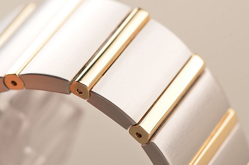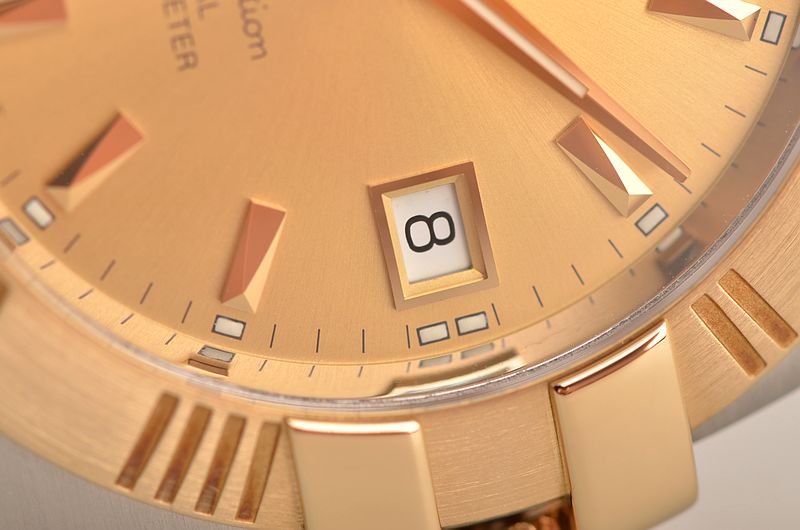 18K黄金及钢表壳及链带,双向按压折叠式表扣。蓝宝石水晶镜面及底盖,立体黄金色表盘,黄金夜光刻度及指针,3点位日历显示功能。18K黄金表冠。口径38MM*11MM。防水100M。