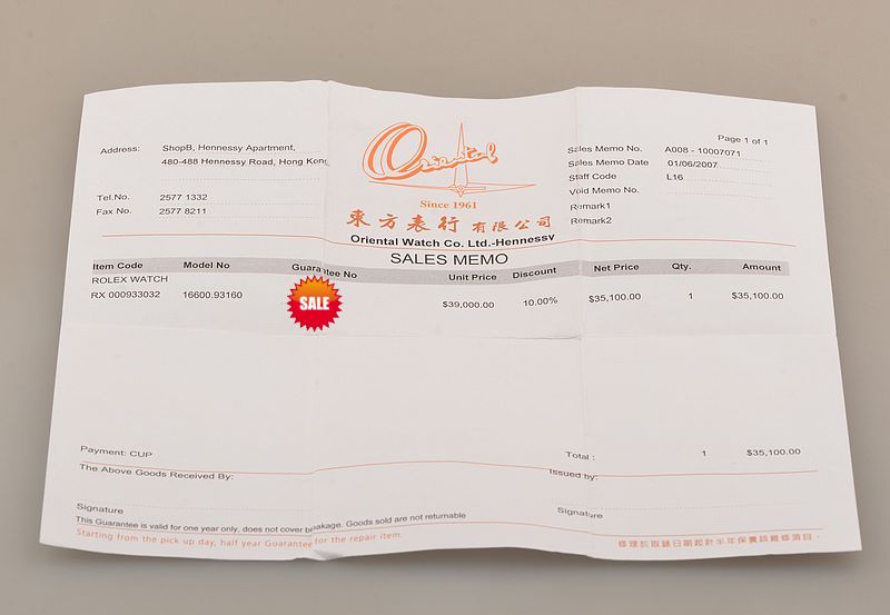 附件齐全,原厂表盒,皮套,保证书,吊牌,出生纸,发票(2007年6月购入于香港东方表行),Z字头表。