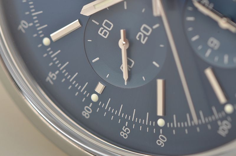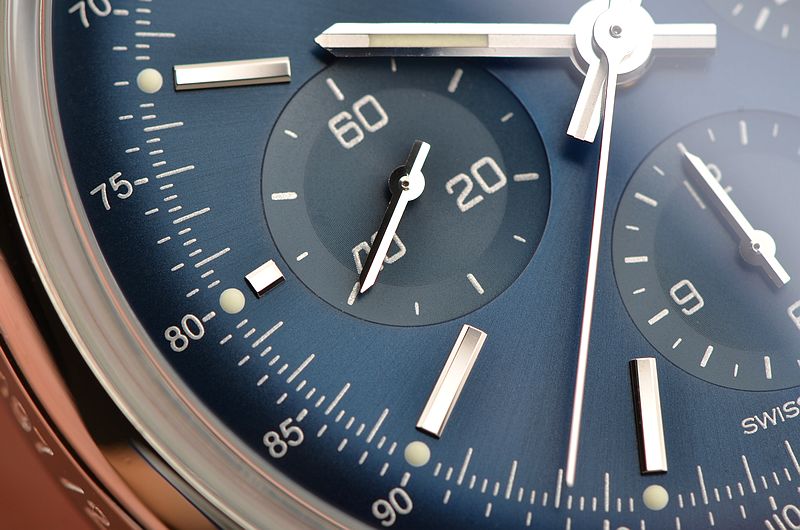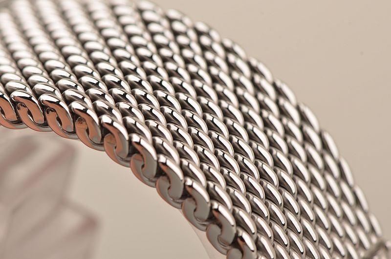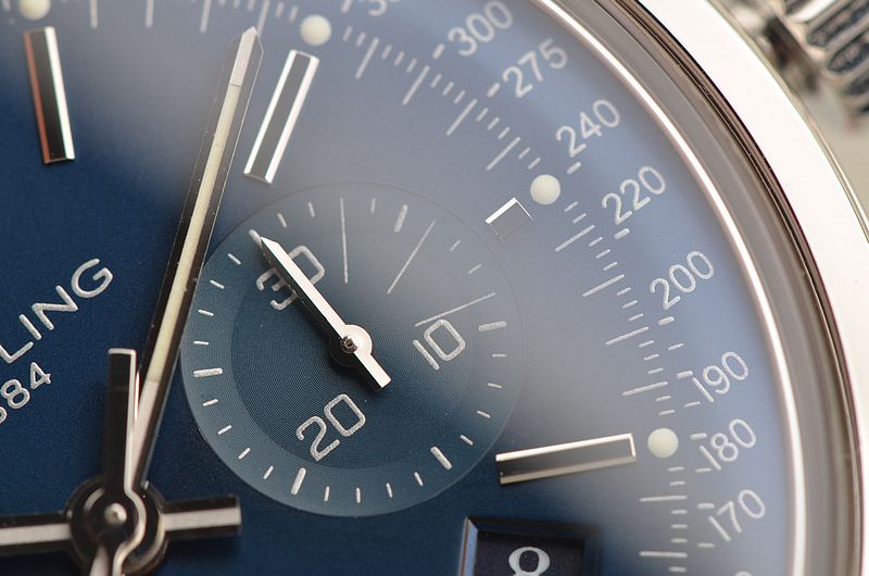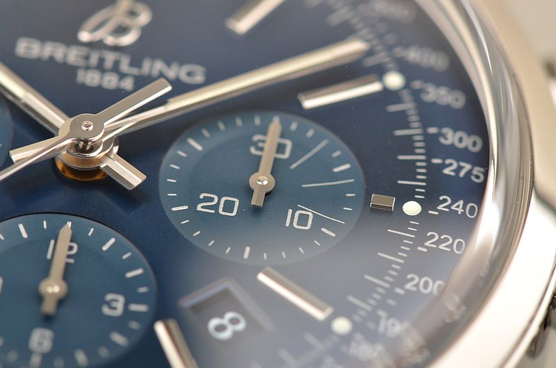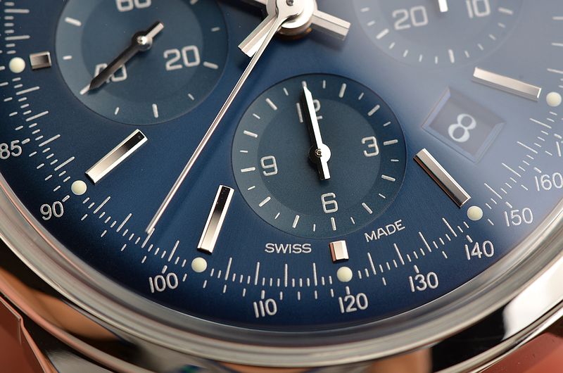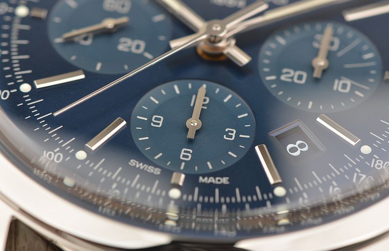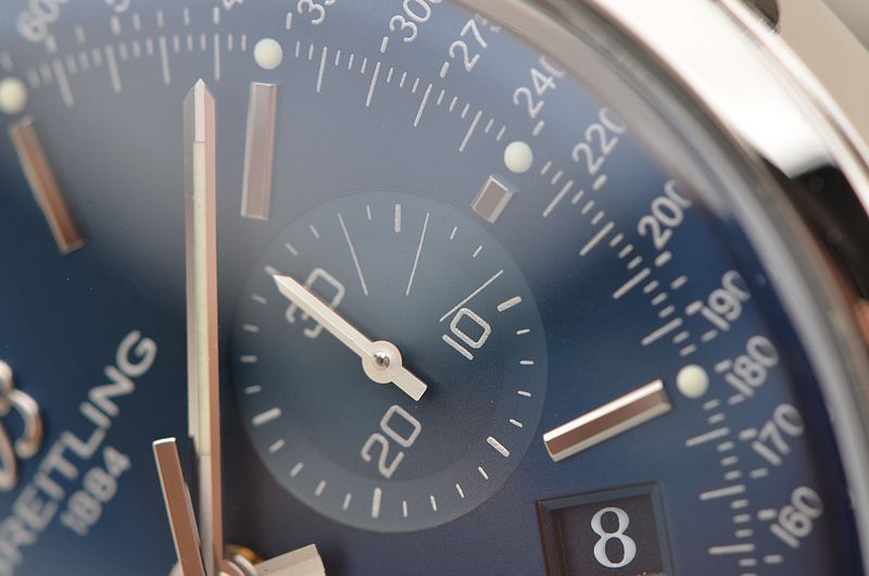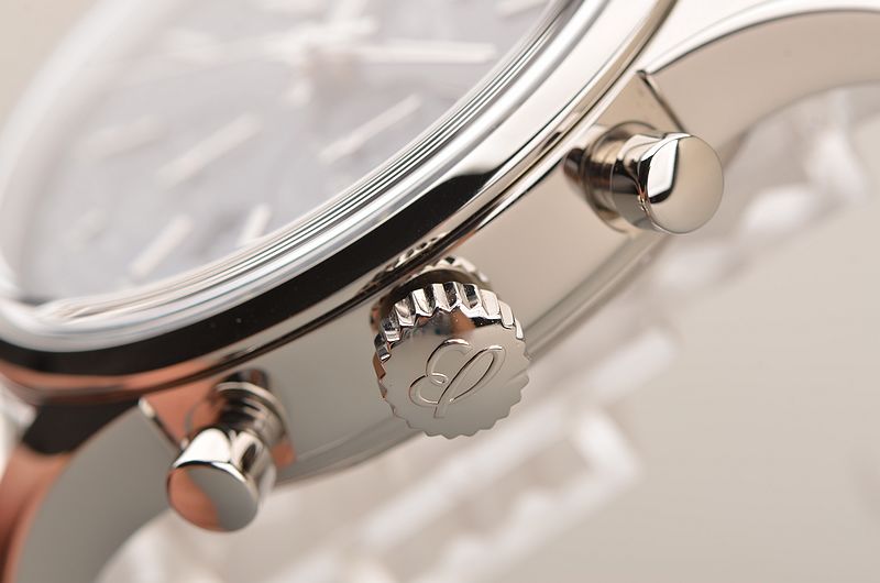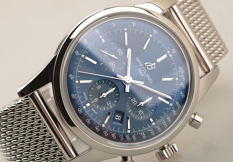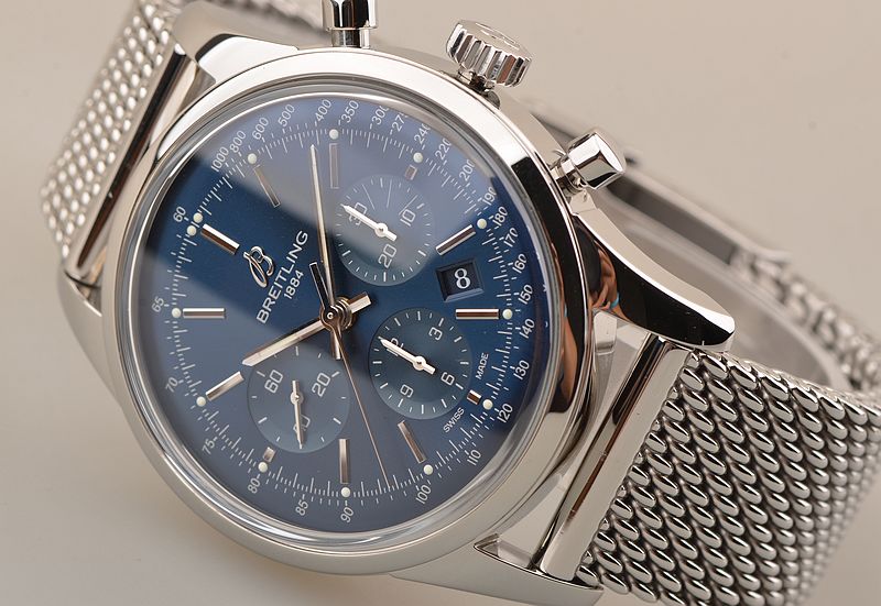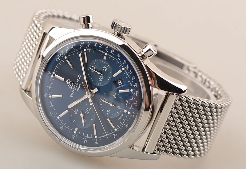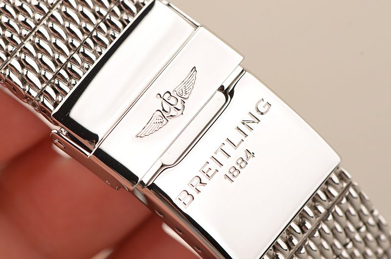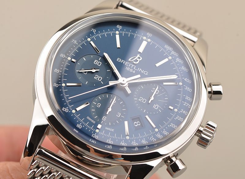 精钢表壳及编织链带,折叠式表扣。蓝宝石水晶镜面及底盖,立体蓝色计时表盘,夜光刻度及指针,测速。9点位独立小秒针,6点位12小时,3点位30分钟计时,4点位日历显示功能。口径43MM*14.35MM。防水100M。