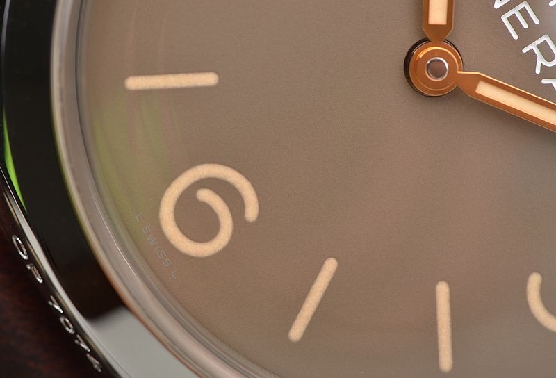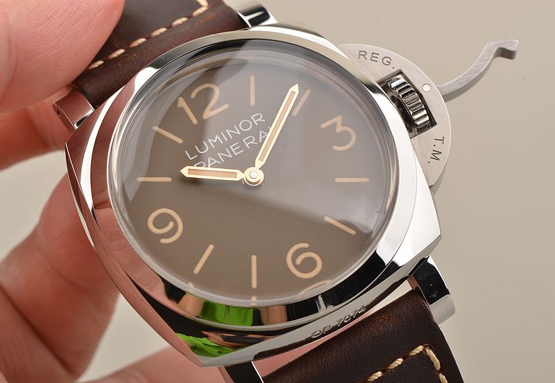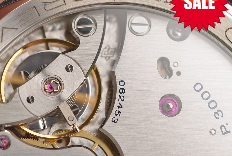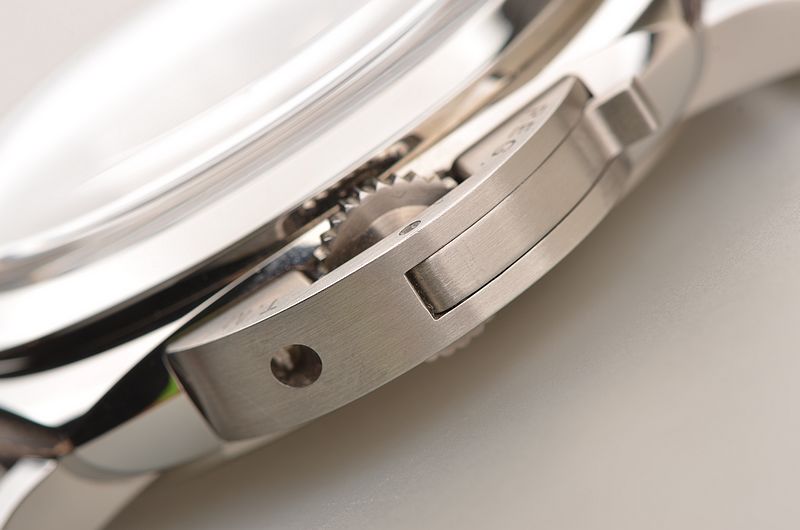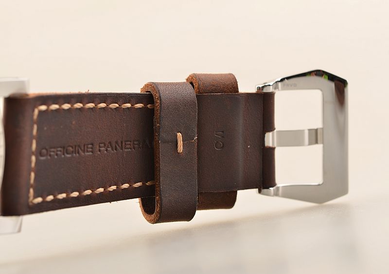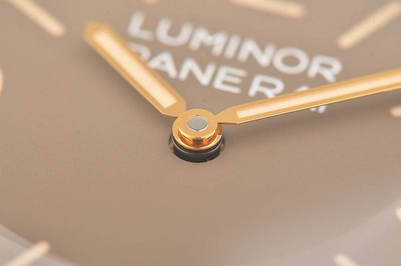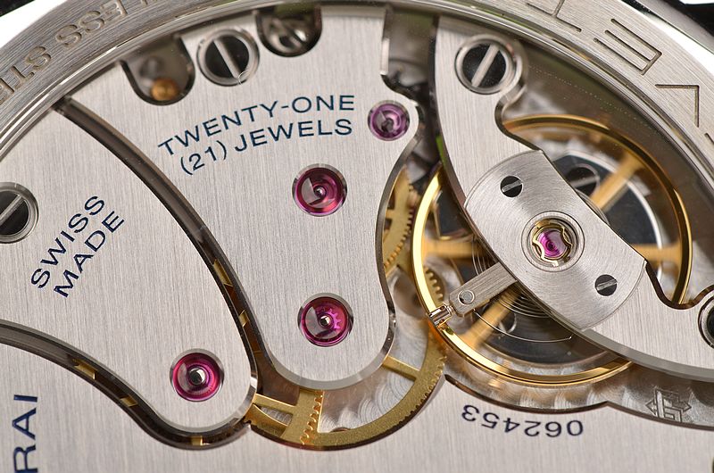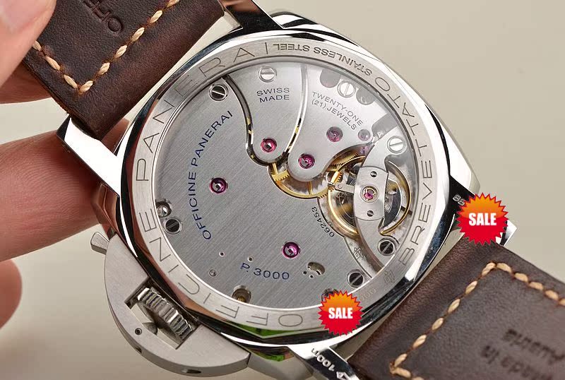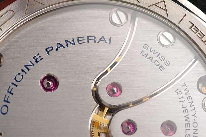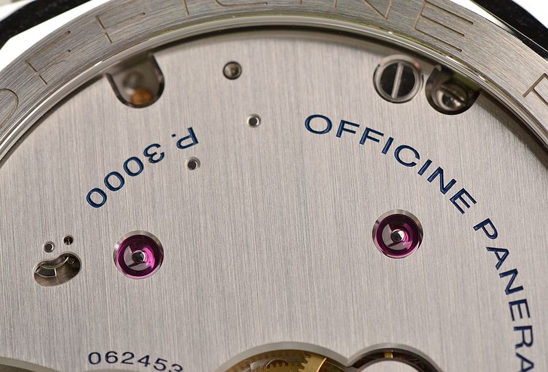沛纳海自产CAL.P3000型机芯,手上链,极其精致日内瓦条纹打磨,倒角抛光修饰。由164个零件组成,双发条盒,Incabloc®防震装置,21钻,摆频21600,动力储存约72小时,三天链。走时状态极佳。