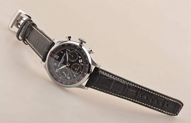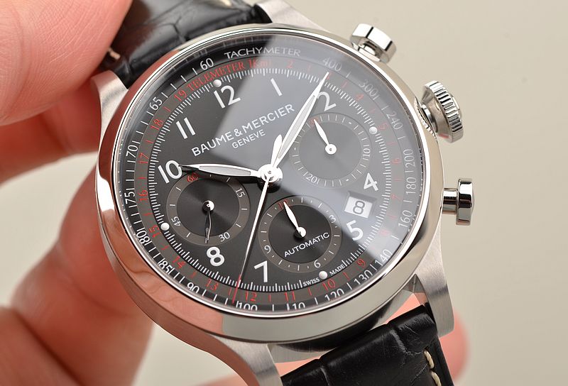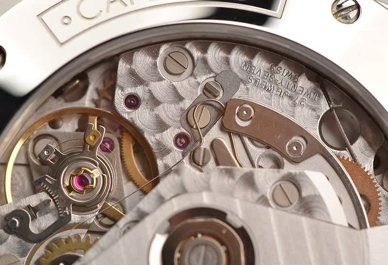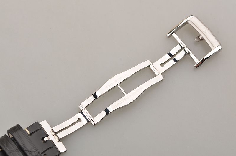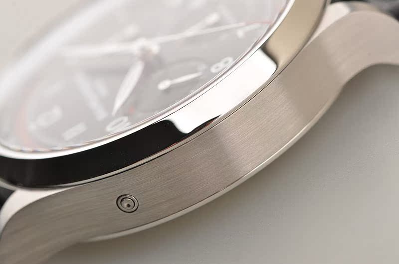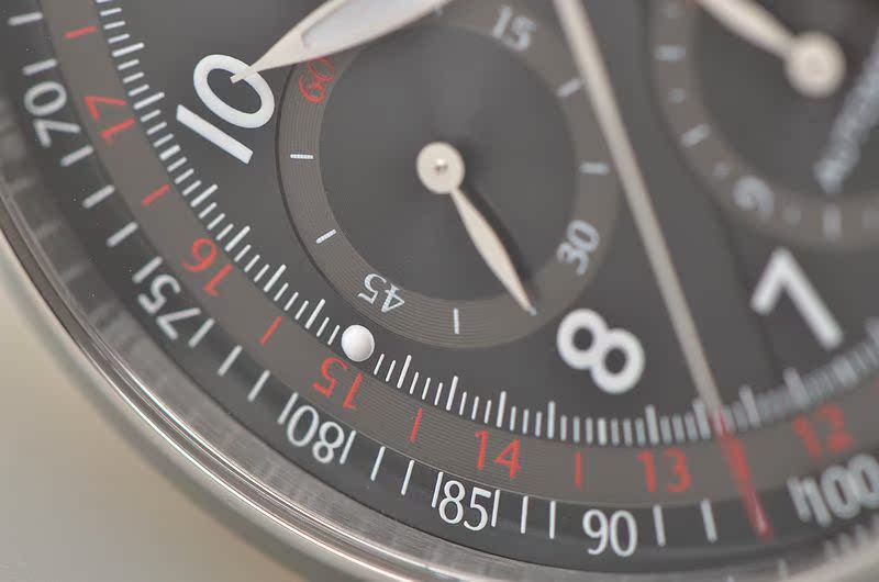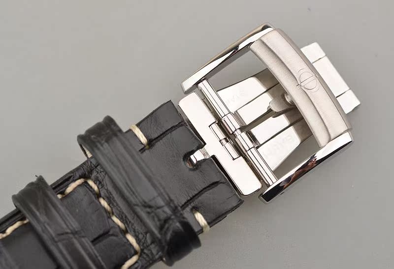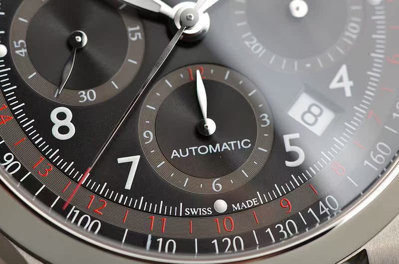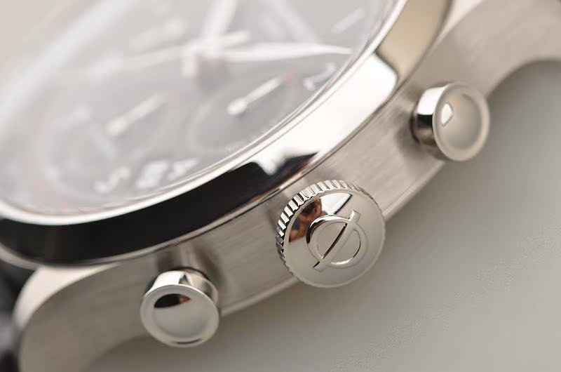 精钢表壳及折叠式表扣,后配全新黑色鳄鱼皮表带。立体黑色计时表盘,阿拉伯数字刻度,时分针及12、3、6、9四个小时位置刻度均有夜光显示。表盘外沿测速圈刻度显示,3点位30分钟计时圈,6点位12小时计时圈,9点位独立小秒针,4、5点位间日历显示窗口。表壳侧面10点位有用作日历快调的调校孔。口径42MM*15MM,防水50M。