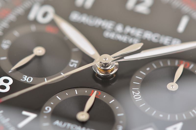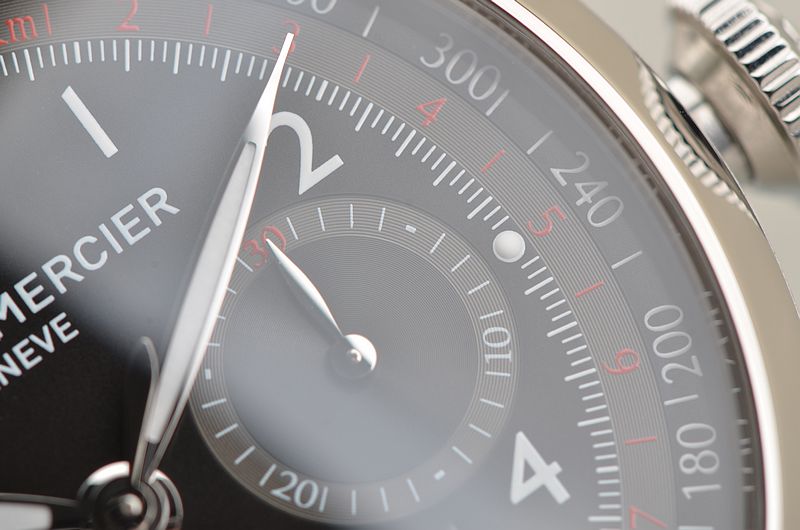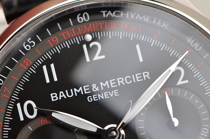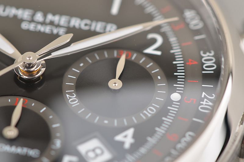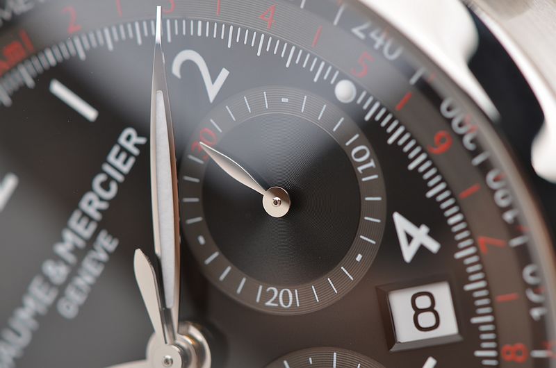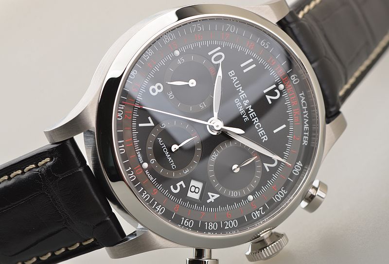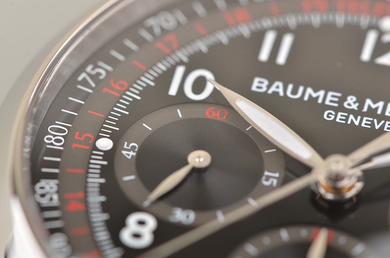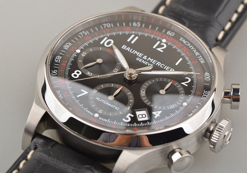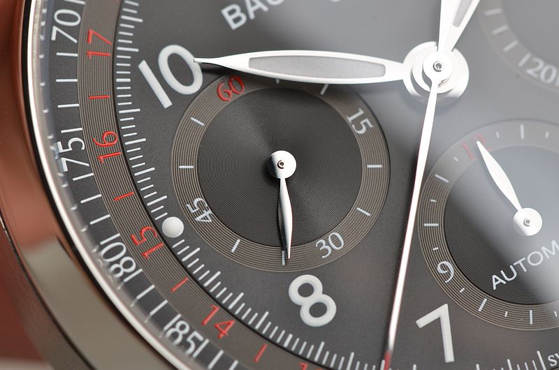 精钢表壳及折叠式表扣,后配全新黑色鳄鱼皮表带。立体黑色计时表盘,阿拉伯数字刻度,时分针及12、3、6、9四个小时位置刻度均有夜光显示。表盘外沿测速圈刻度显示,3点位30分钟计时圈,6点位12小时计时圈,9点位独立小秒针,4、5点位间日历显示窗口。表壳侧面10点位有用作日历快调的调校孔。口径42MM*15MM,防水50M。
