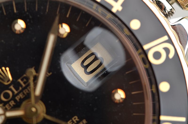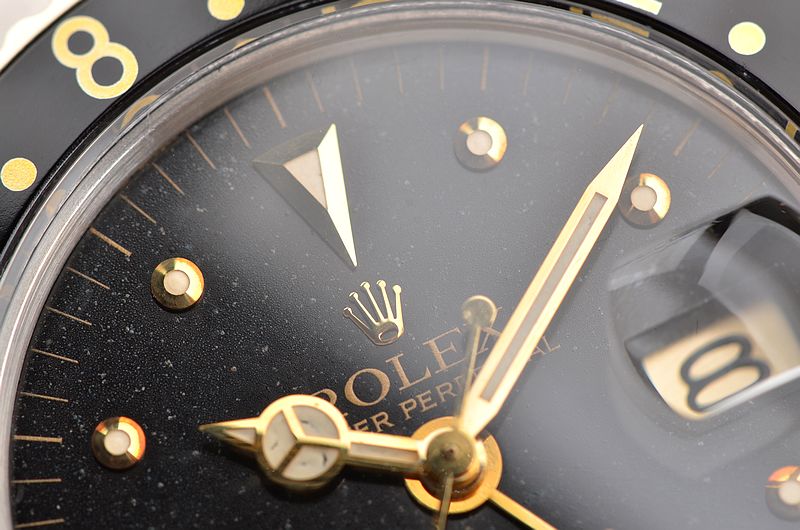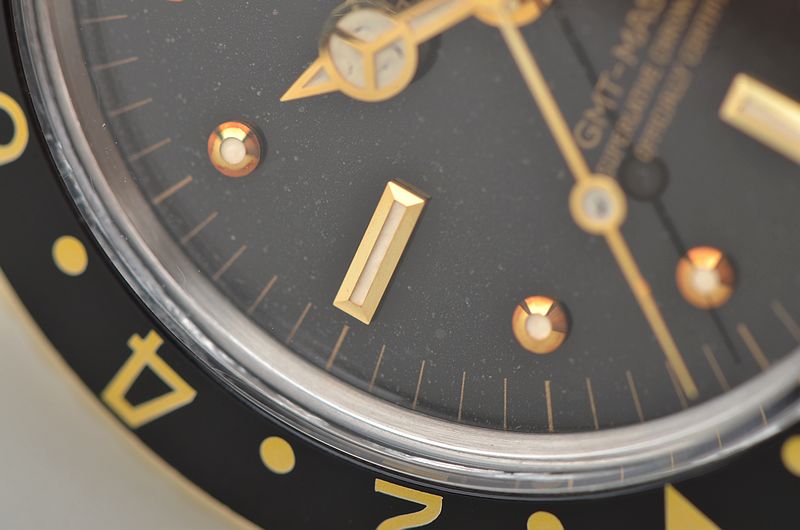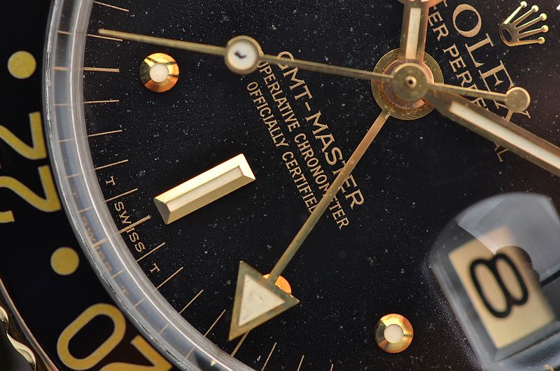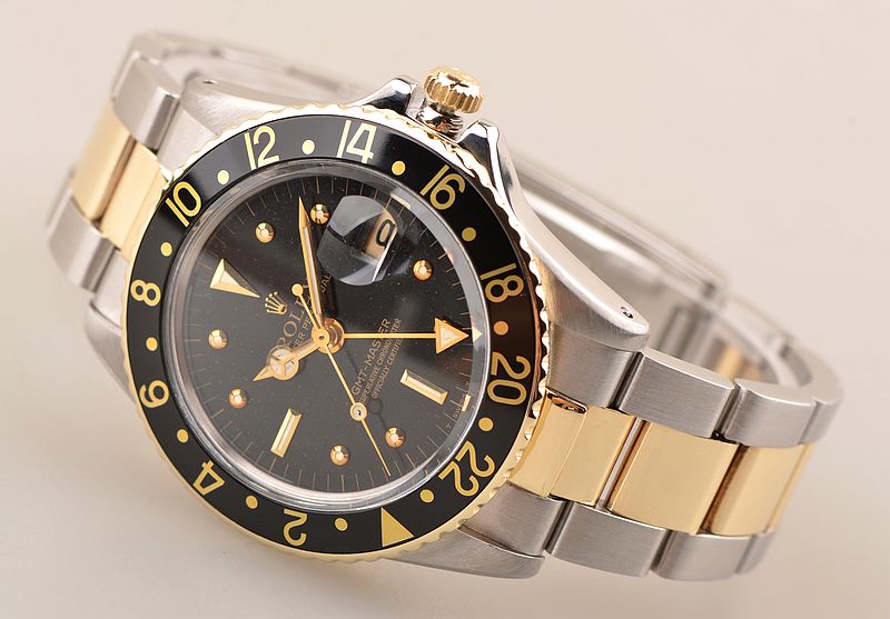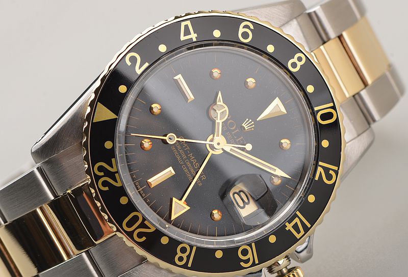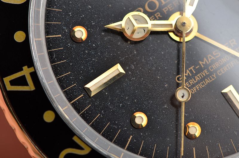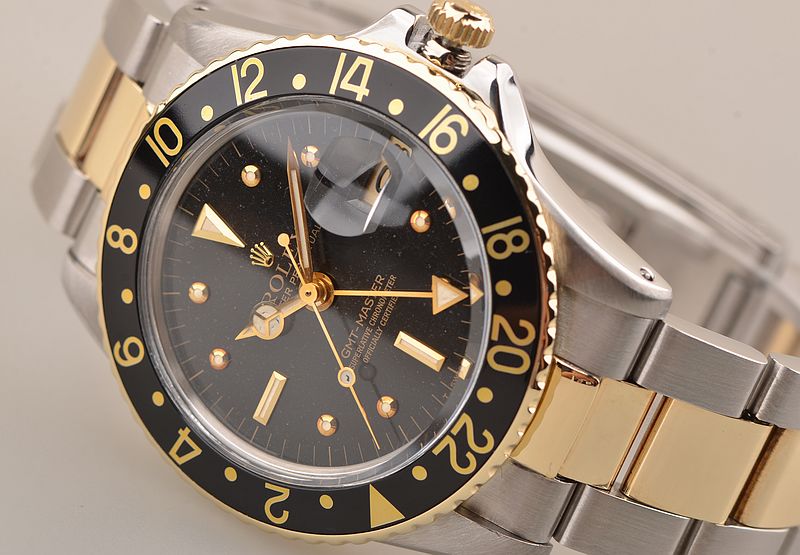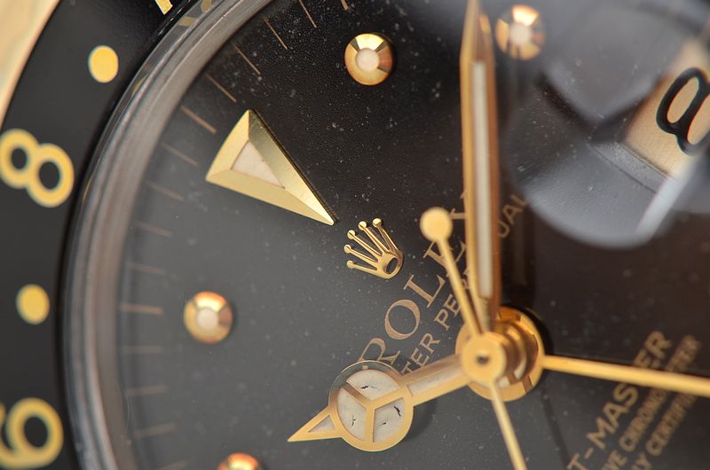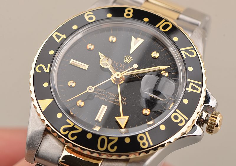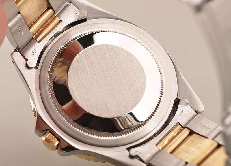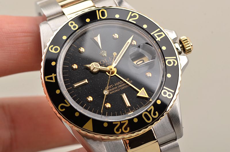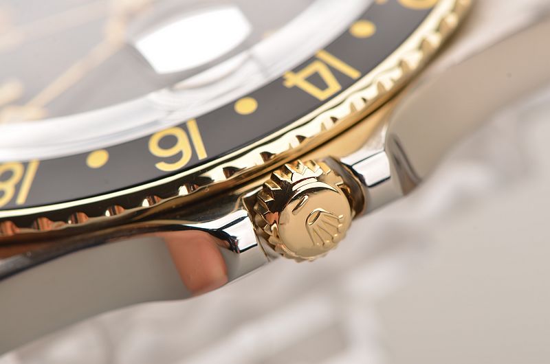 精钢及18K黄金表壳及板带,黑色双向旋转GMT表圈。蓝宝石水晶镜面,立体黑色表盘(已自然氧化,蜘蛛沙金面),黄金刻度及指针,GMT第二时区功能。3点位放大镜日历视窗。旋入式防水表冠。口径40MM*13MM。防水100M。