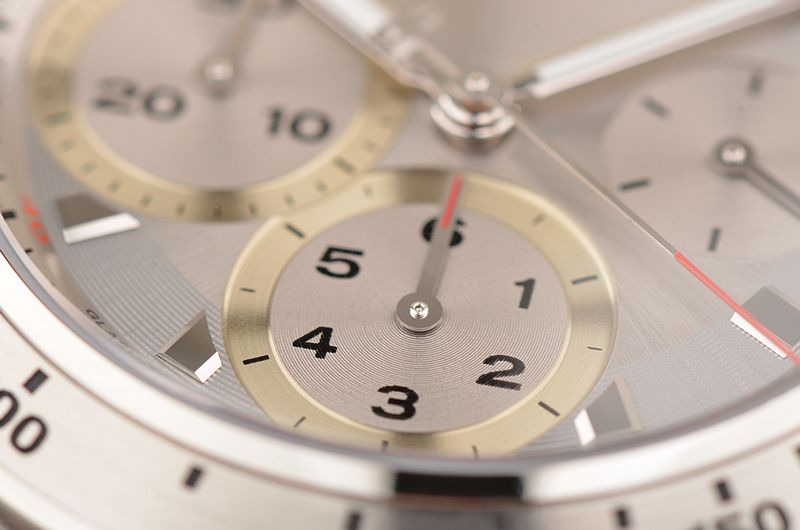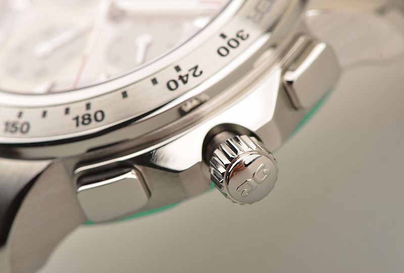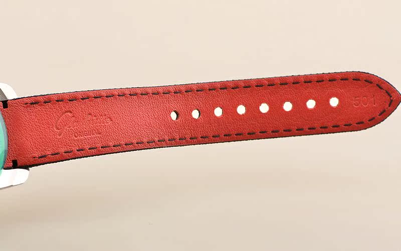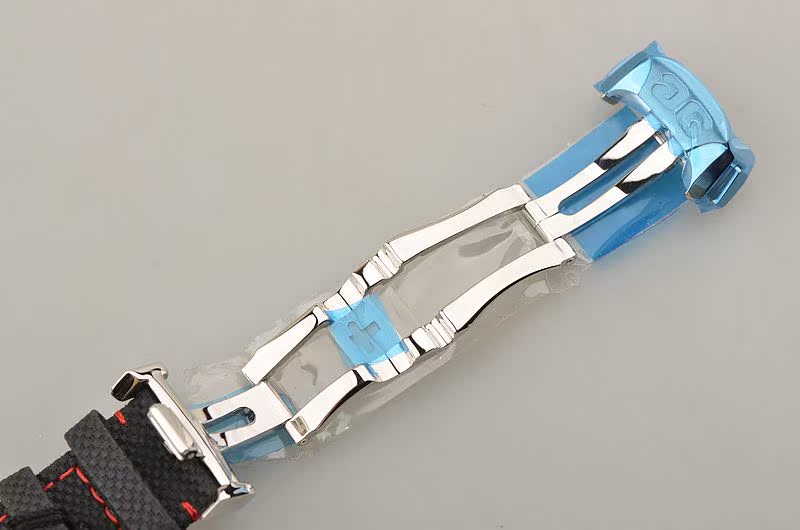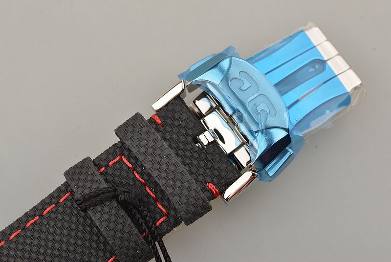 精钢表壳,按压式双向折叠表扣。全新原厂黑色尼龙编织内衬红色皮革表带。蓝宝石水晶镜面及底盖,立体银灰色拉丝计时表盘,精钢测速表圈,3点位独立小秒针,6点位6小时计时盘,9点位30分钟计时盘,时标12点位置及时分针均有夜光。旋入式防水锁把。口径42MM*14.15MM。防水100M。