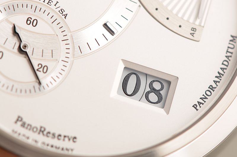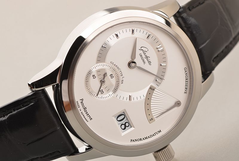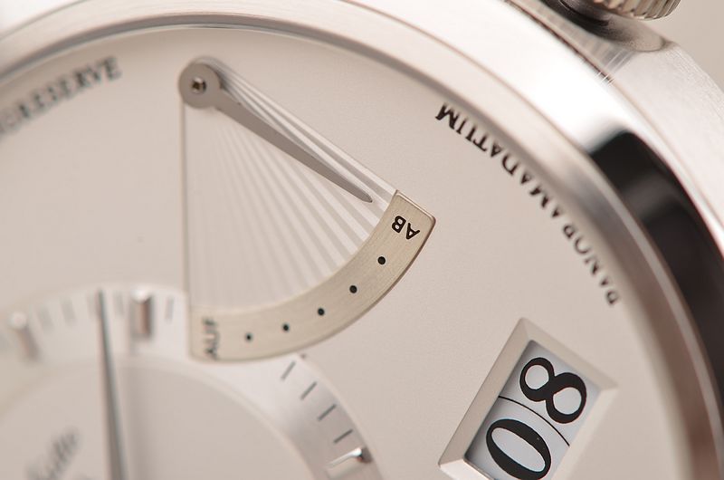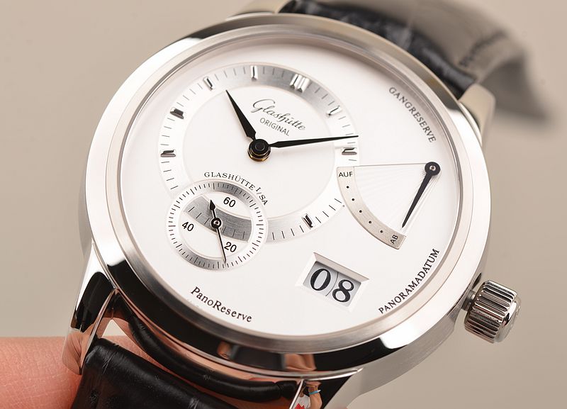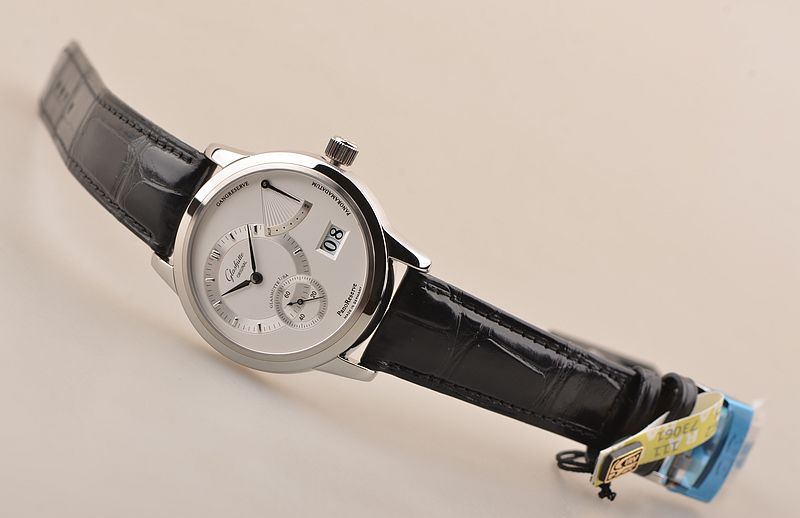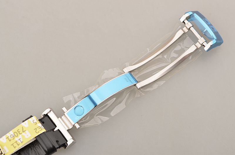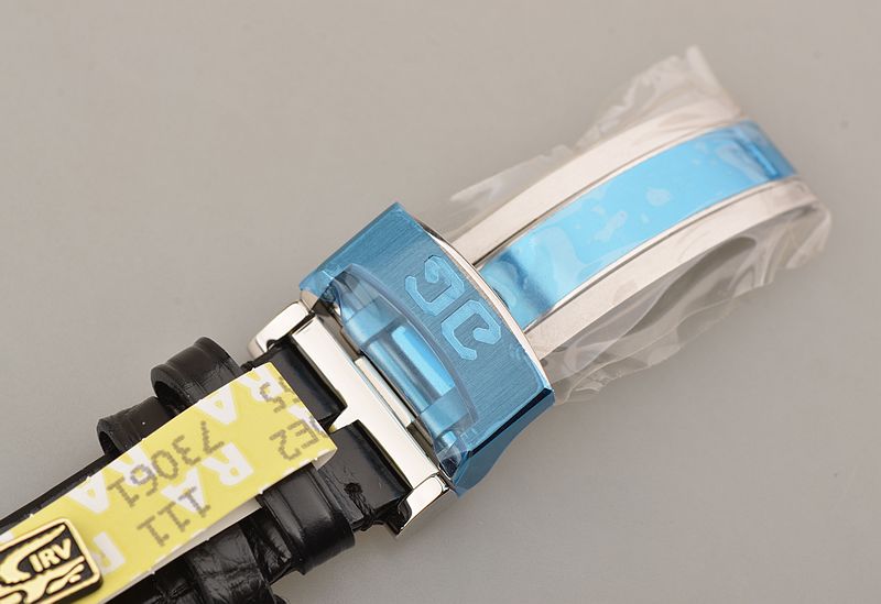 精钢表壳及折叠式表扣,全新原厂黑色路易斯安娜短吻鳄鱼皮表带。蓝宝石水晶镜面及底盖,立体银白色偏心表盘,小三针,专利大日历视窗,扇形指针式动能储备显示功能。口径39.4MM*11.3MM。防水30M。