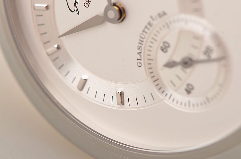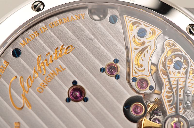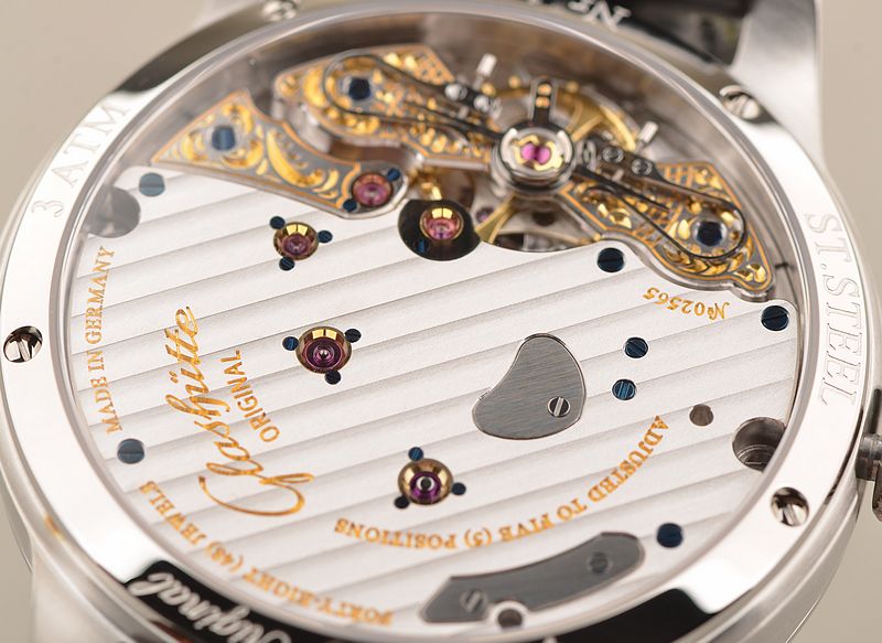 GO自产的65-01型机芯,手动机械,标准德式3/4大夹板机芯,极其精致人手条纹打磨,倒角抛光修饰,黄金套筒,双鹅颈微调美轮美奂,人手精密机械工艺与欧洲美学艺术的完美结合,48钻,摆频28800,机芯有独立签署,5方位校正。动力储备约42小时,走时状态极佳。