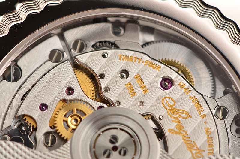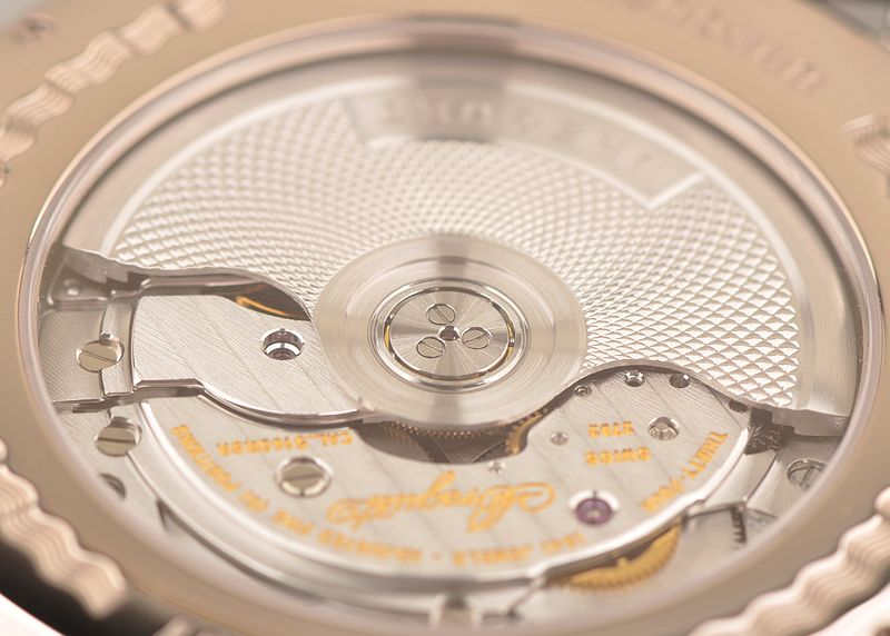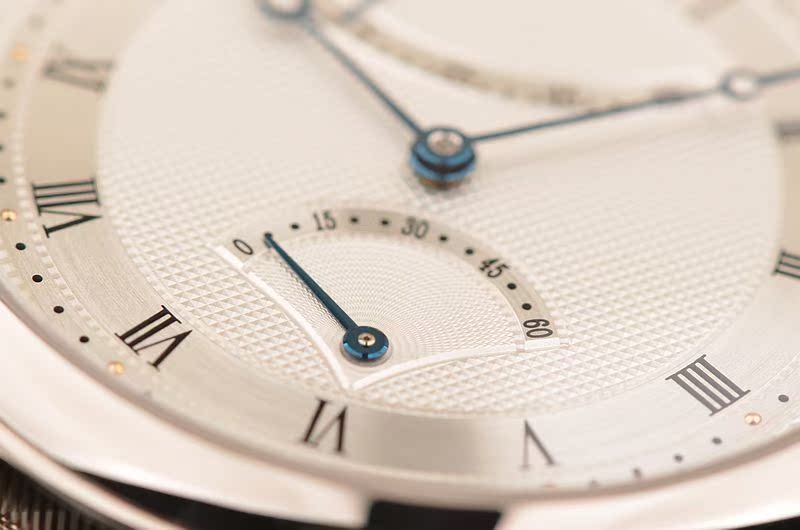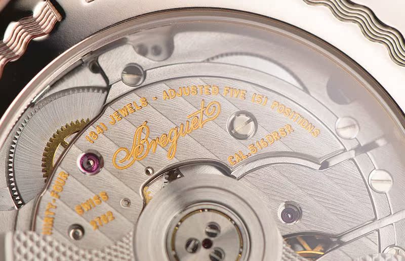 宝玑自产的516DRSR机芯,自动机械,动储显示及表针逆跳功能。34钻,摆频28800,5方位校正,精致日内瓦纹及鱼鳞纹打磨,白金手工镌刻自动摆陀,动力储备约65小时,长动力机芯。走时状态极佳。