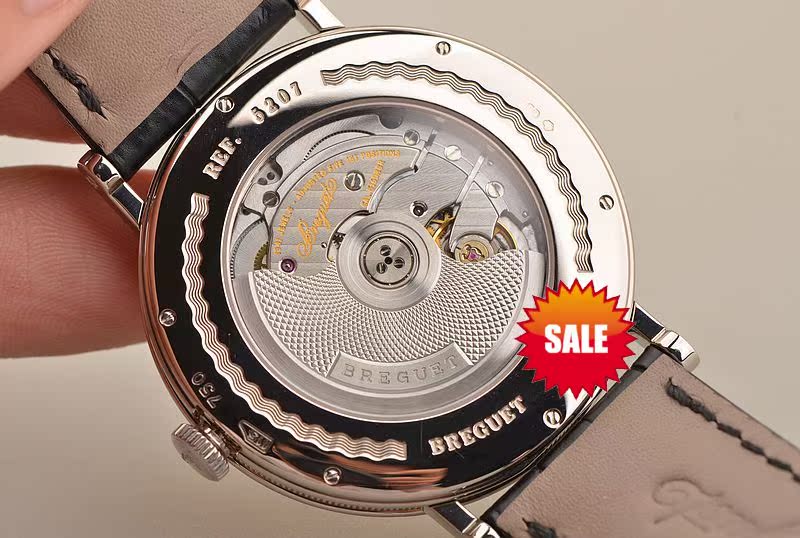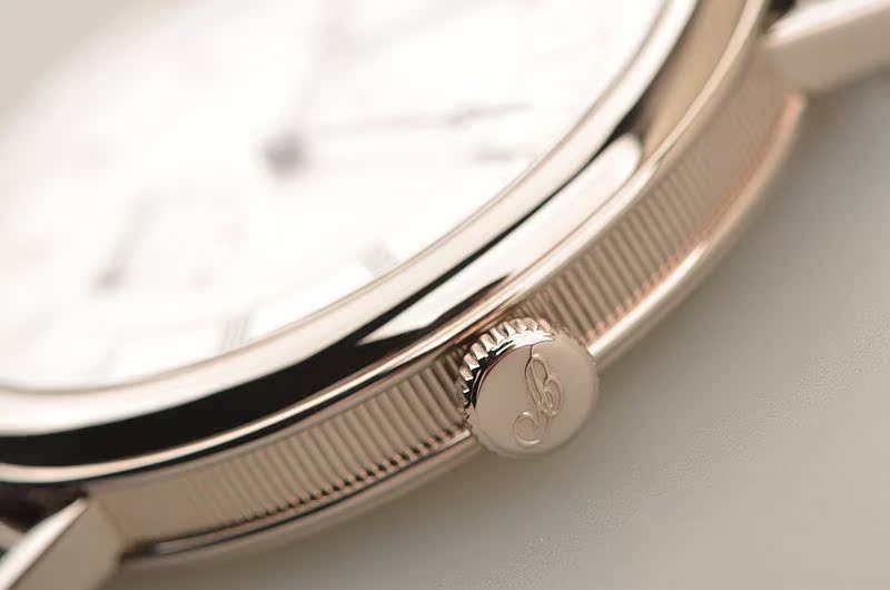 18K白金钱币纹宝玑表壳及折叠式表扣,圣伯纳狗头印记。后配黑色鳄鱼皮表带成色极新。蓝宝石水晶镜面及底盖。手工镌刻镀银金表盘。宝玑字体防伪LOGO。蓝钢宝玑指针。口径39MM*9.85MM。防水30M。