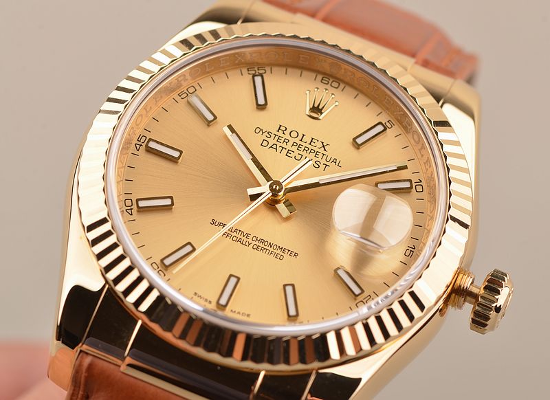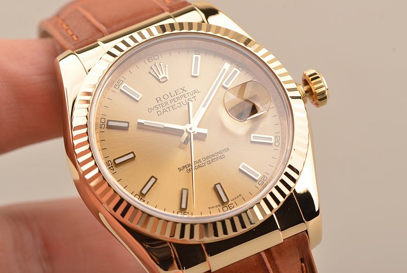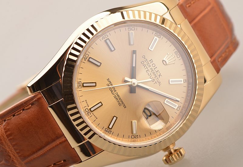 18K黄金表壳及折叠式表扣,18K黄金三角坑纹表圈,圣伯纳狗头印记。后配全新棕色鳄鱼皮表带。蓝宝石水晶镜面,立体香槟金色表盘,夜光刻度及指针。3点位放大镜日历视窗,旋入式防水表把。口径36MM*12MM。防水100M。