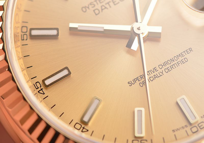 50小时动力储备,31钻,摆频28800。日历显示,瑞士天文台及劳力士双重认证,螺母摆轮调节系统、无卡度Breguet游丝、KIF防振器。走时状态极佳。