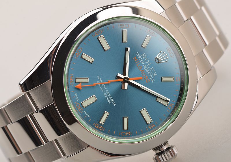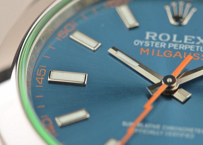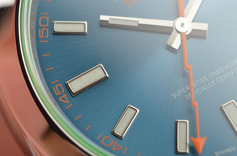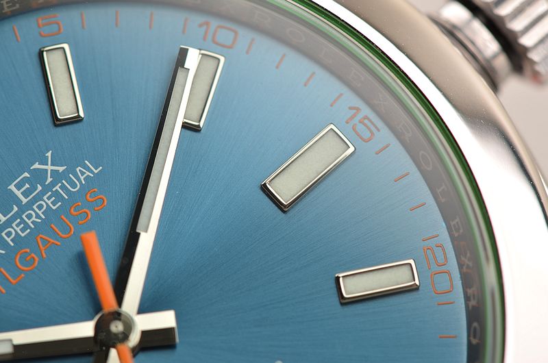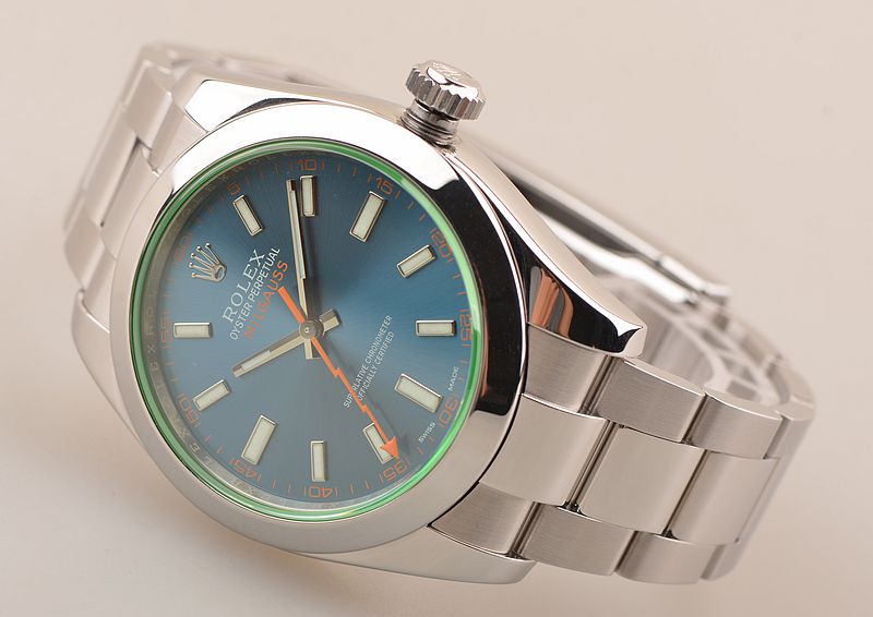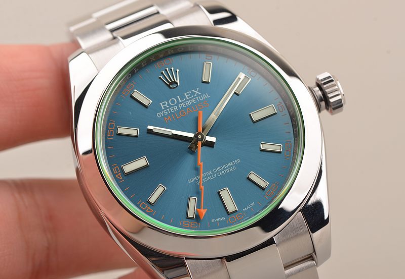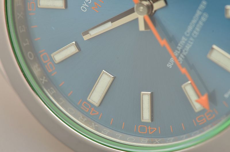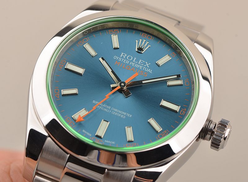 904L精钢表壳及链带,折叠式表扣。绿色蓝水晶玻璃镜面,立体蓝色表盘,瑞士天文台认证标识,夜光刻度及时分针,橙色闪电秒针。旋入式防水表冠。口径40MM*12.5MM。防水100M。