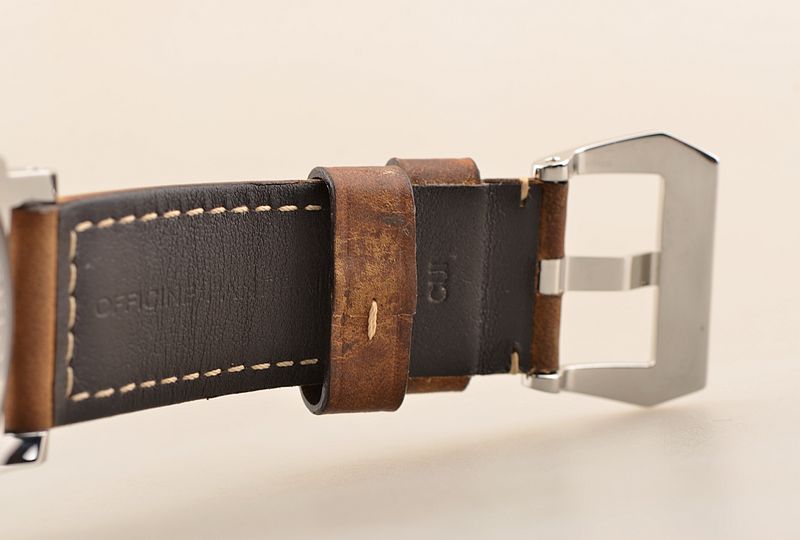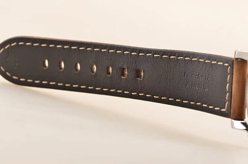 沛纳海自产CAL.P.5000型机芯,手上链,极其极致日内瓦条纹打磨,倒角抛光修饰。由127个零件组成,双发条盒,21钻,摆频21600,八天链长动力机芯。走时状态极佳。
