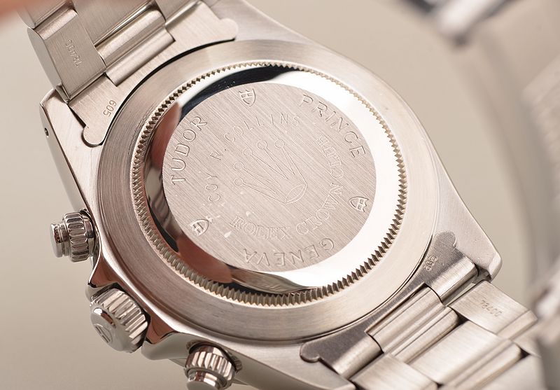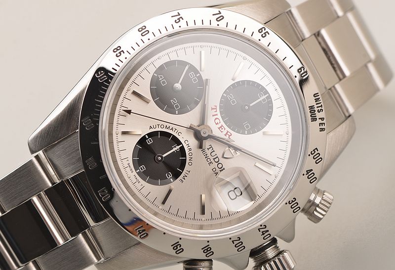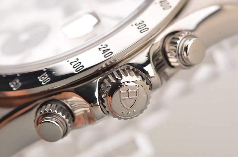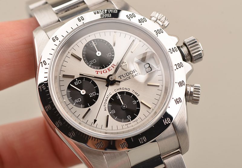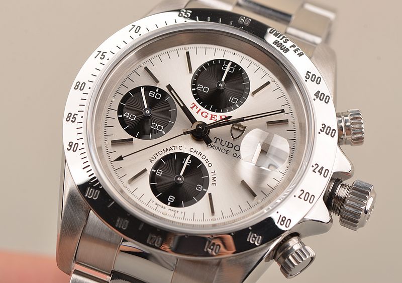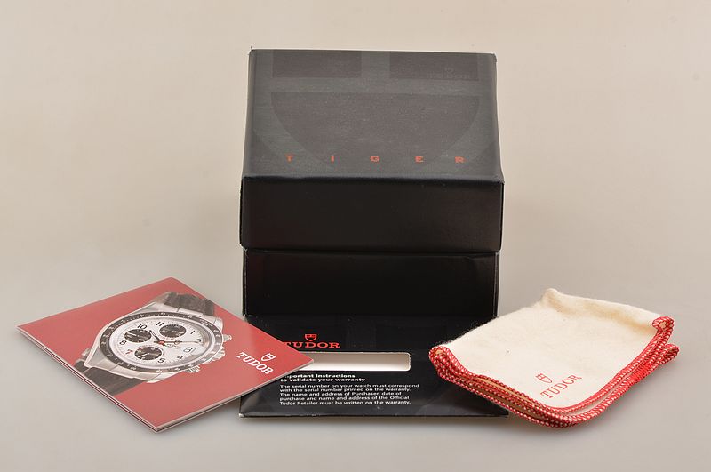 精钢表壳及链带,折叠式可微调表扣。测速表圈,蓝宝石水晶镜面,立体熊猫盘,红TIGER字。12点位30分钟计时,9点位独立小秒针,6点位12小时计时。3点位放大镜日历视窗,旋入式防水表冠。原厂底盖后刻劳力士皇冠(劳力士表友收藏会)。口径40MM*14.8MM,防水100M。