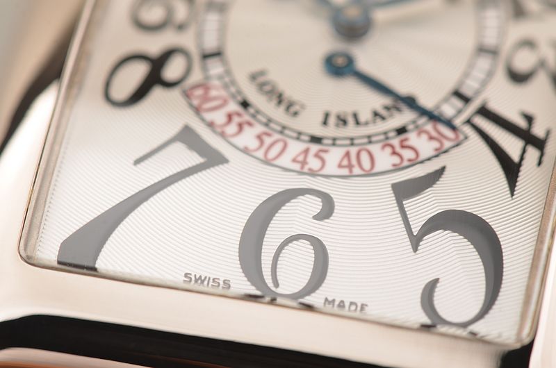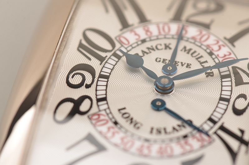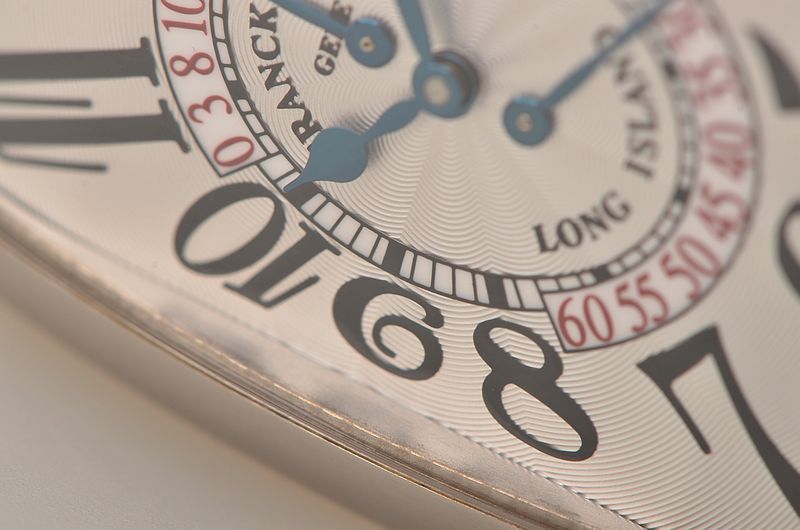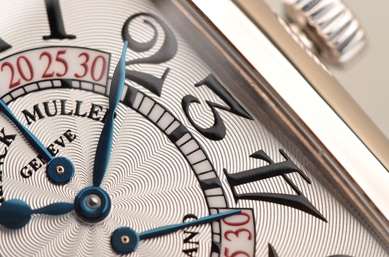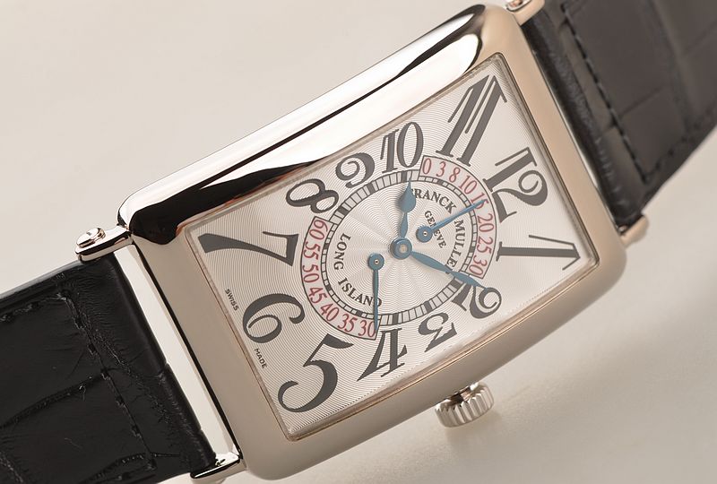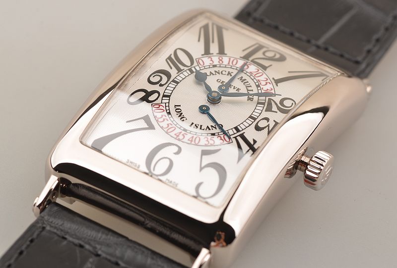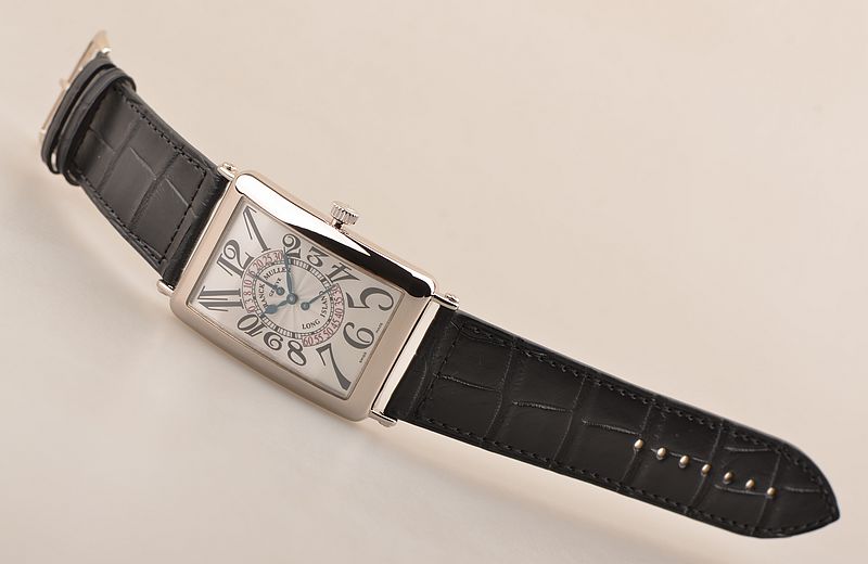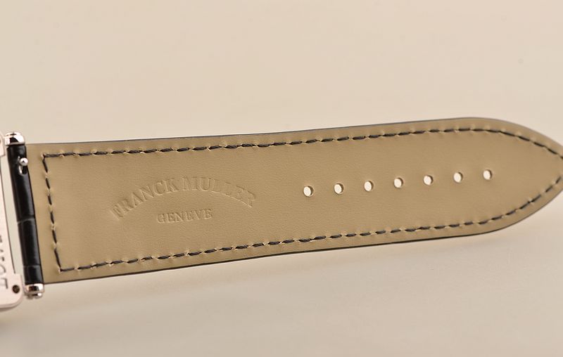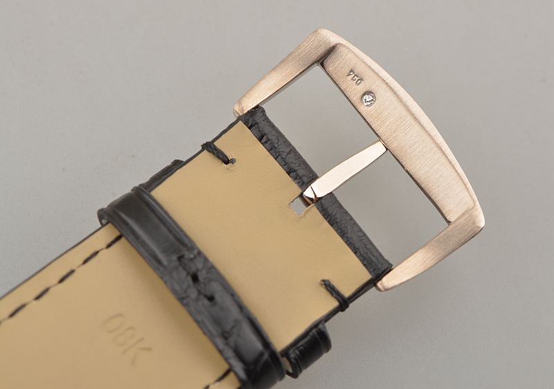 18K白金表壳及表扣,圣伯纳狗头印记。后配全新黑色鳄鱼皮表带。蓝宝石水晶镜面,立体银白色太阳纹表盘,黑色阿拉伯数字刻度,蓝钢指针,秒针飞返逆跳功能。口径54MM*32MM*10.8MM,相当于圆表43MM左右大小。防水30M。