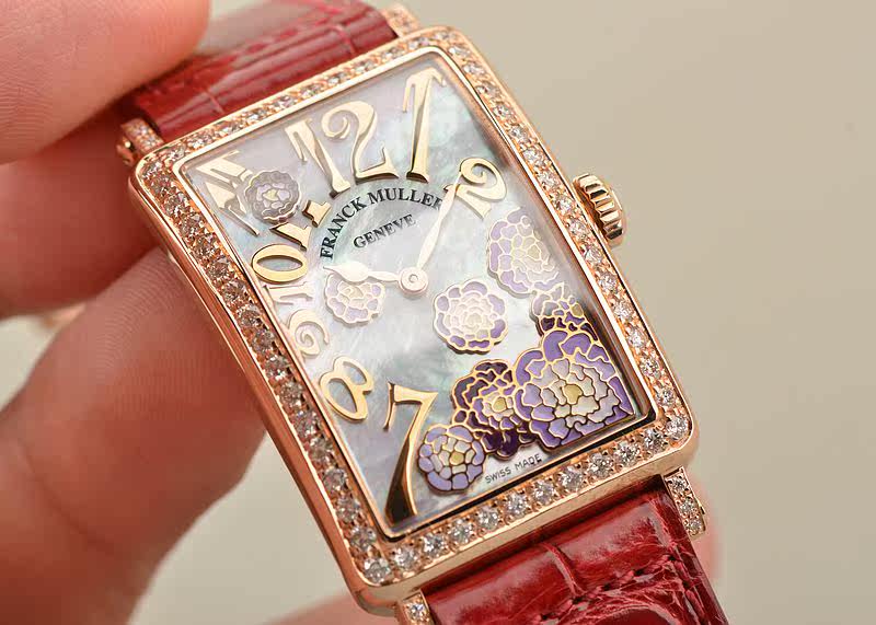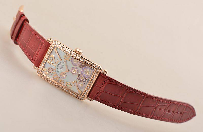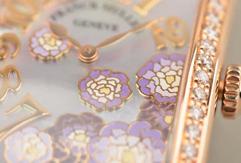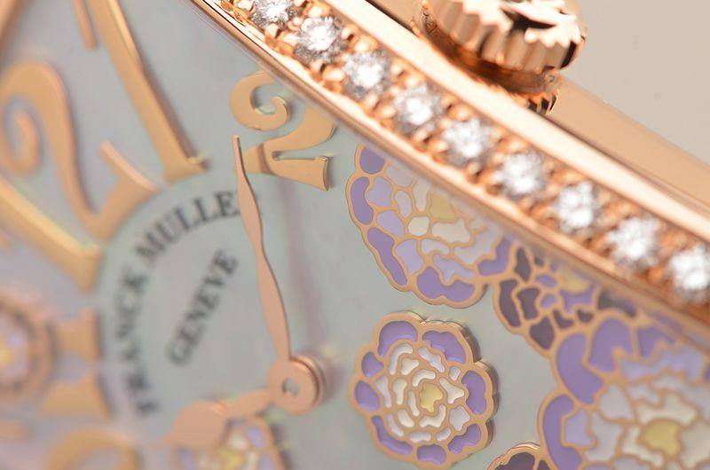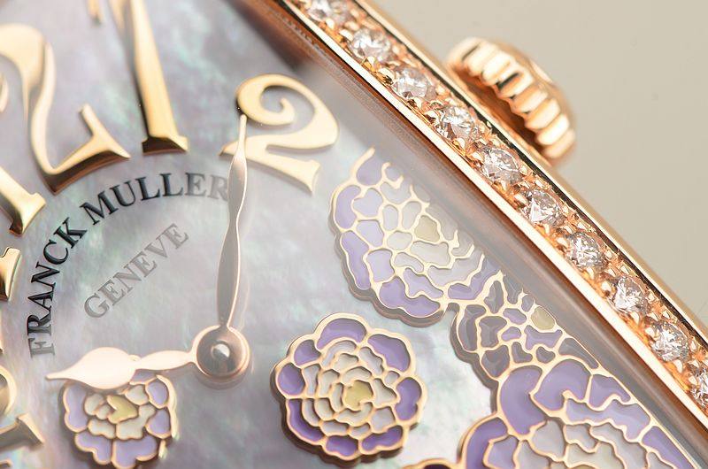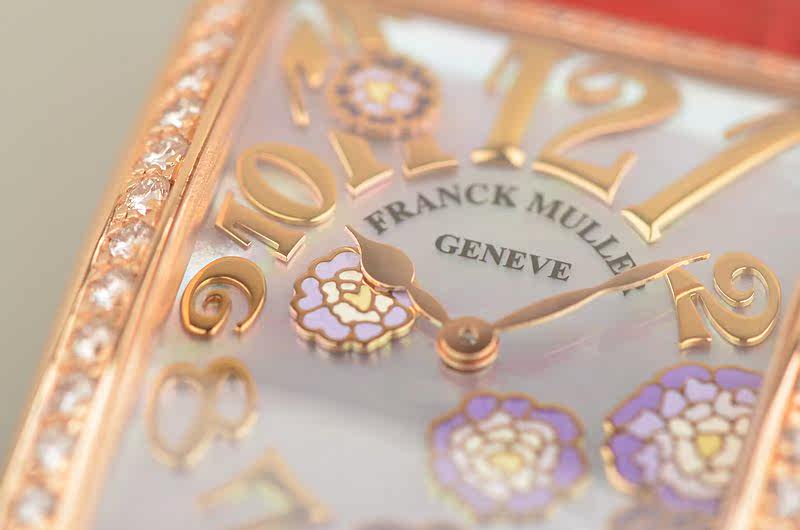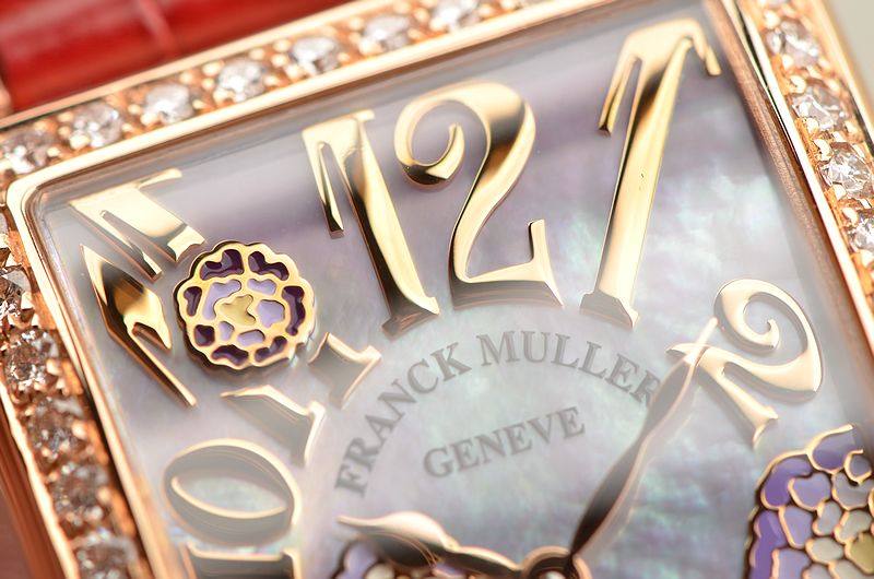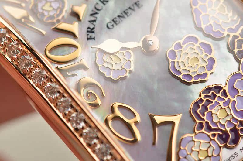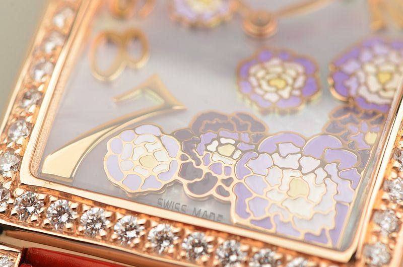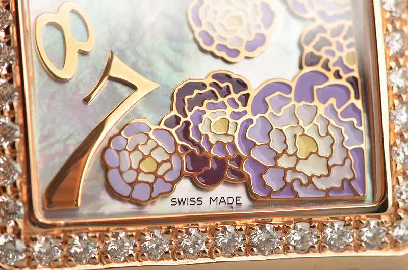 18K玫瑰金表壳及表扣,圣伯纳狗头印记。表圈、表耳及表扣镶嵌原厂豪华天然美钻(非后加钻)。全新原厂深红色鳄鱼皮表带。蓝宝石水晶镜面,立体紫色珍珠贝母表盘配有人手彩绘花朵图案,金质指针及阿拉伯数字刻度。口径44.4MM*25.9MM*7.3MM,相当于圆表36MM左右大小。防水30M。