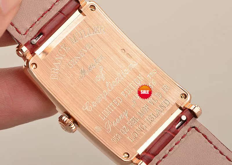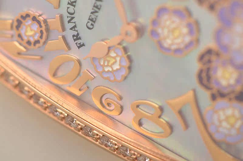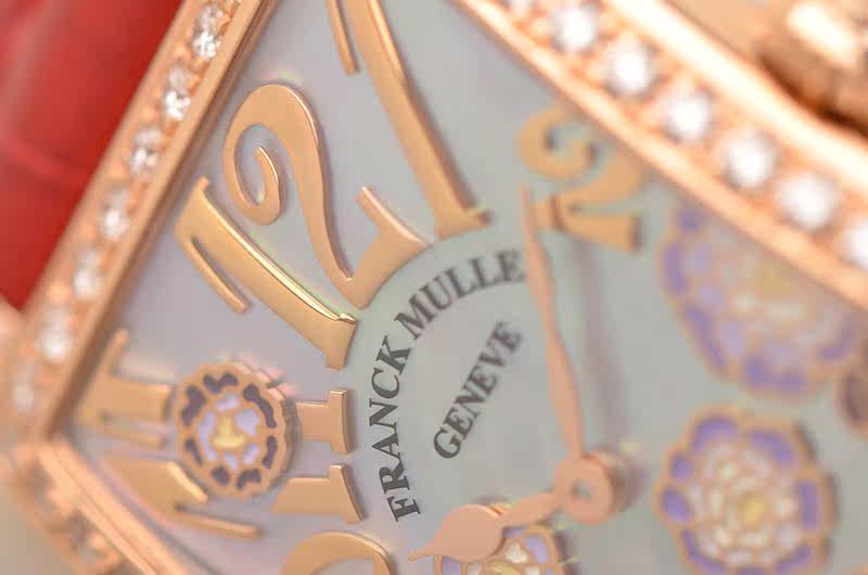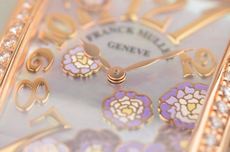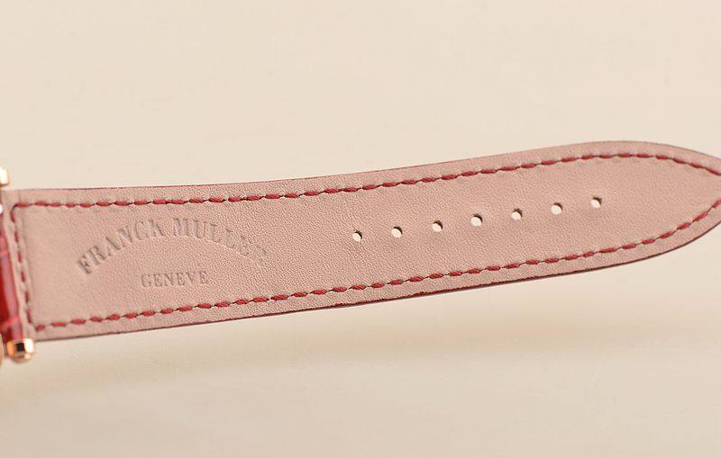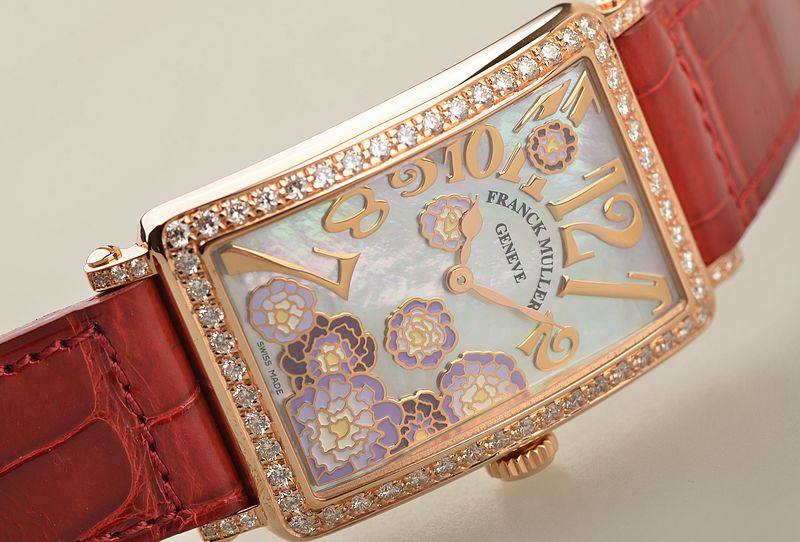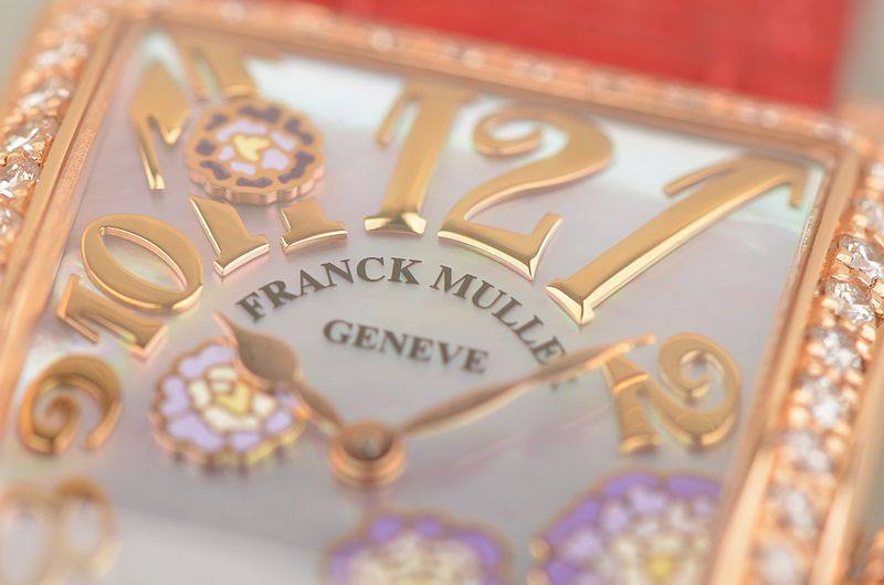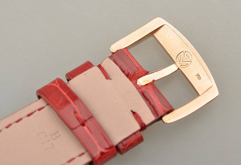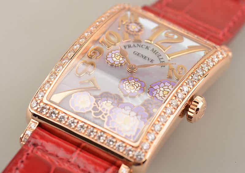 18K玫瑰金表壳及表扣,圣伯纳狗头印记。表圈、表耳及表扣镶嵌原厂豪华天然美钻(非后加钻)。全新原厂深红色鳄鱼皮表带。蓝宝石水晶镜面,立体紫色珍珠贝母表盘配有人手彩绘花朵图案,金质指针及阿拉伯数字刻度。口径44.4MM*25.9MM*7.3MM,相当于圆表36MM左右大小。防水30M。