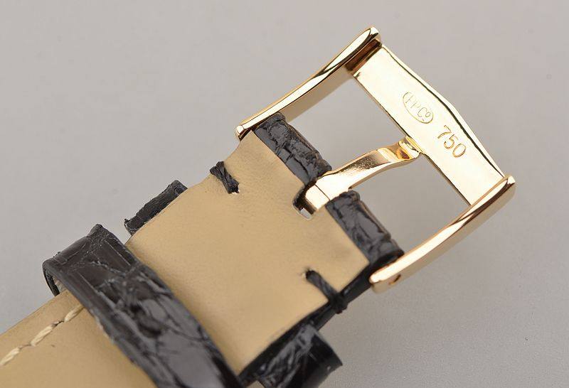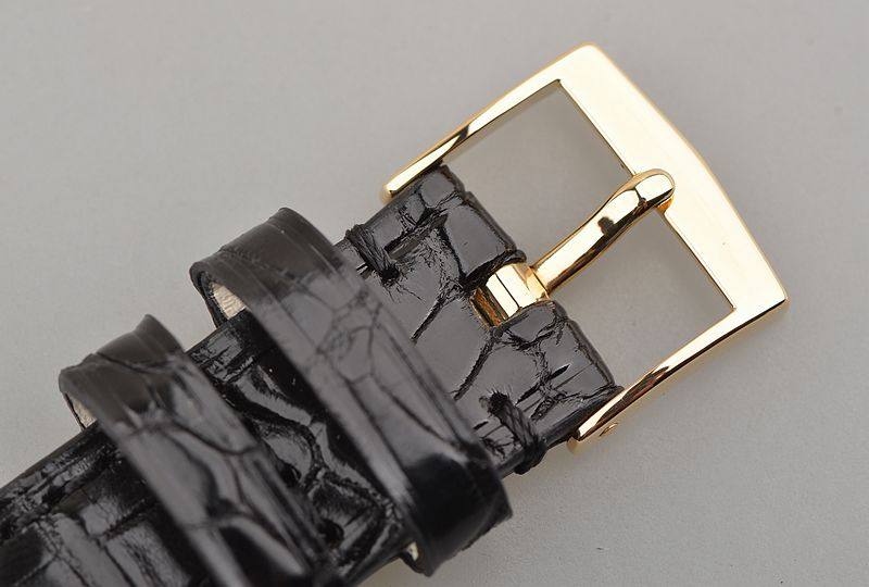 18K黄金表壳及表扣,女皇头印记。后配全新黑色鳄鱼皮表带。蓝宝石水晶镜面,立体银白色表盘,黄金刻度及指针,简约小三针设计。口径32MM*6.6MM,防水30M。
