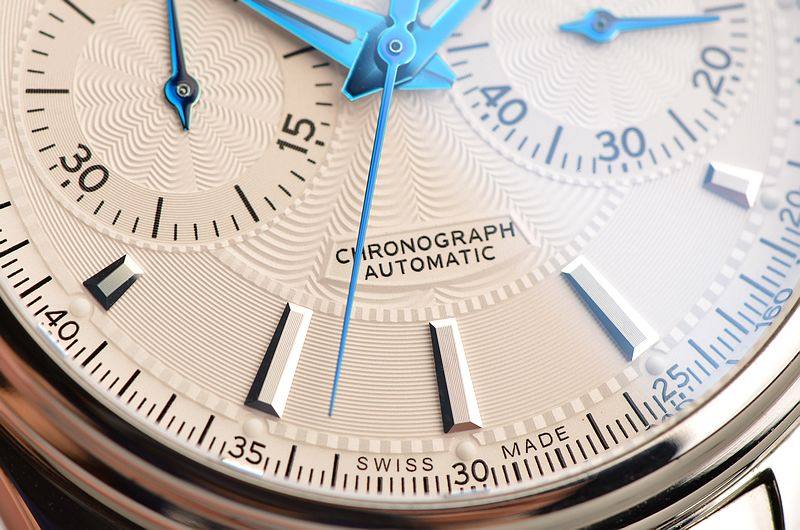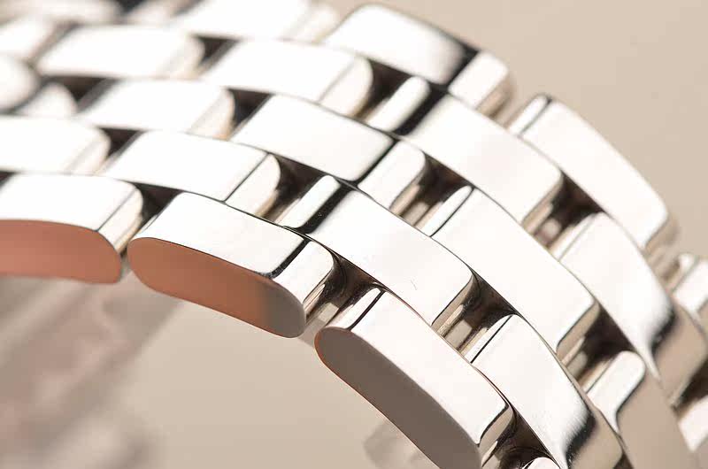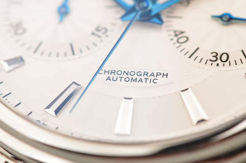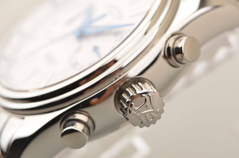 精钢表壳及链带,按压式双向折叠式表扣。蓝宝石水晶镜面及底盖,立体白色雕刻玑镂花纹计时表盘,测速圈位于表圈内侧,蓝钢指针,夜光圆点时标及时分针,3点位独立小秒针,9点位45分钟计时圈。口径43MM*15MM。旋入式防水锁把,防水100M。