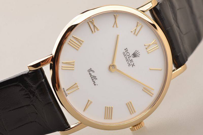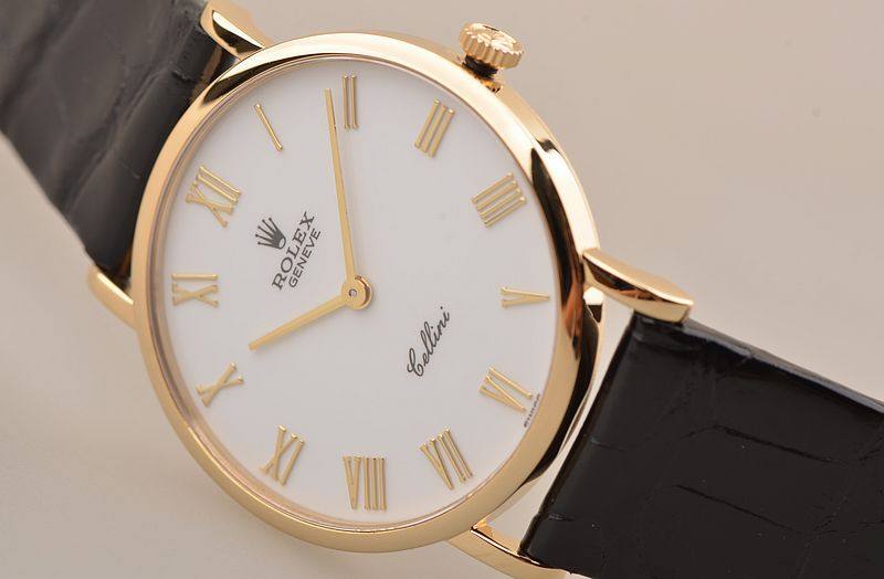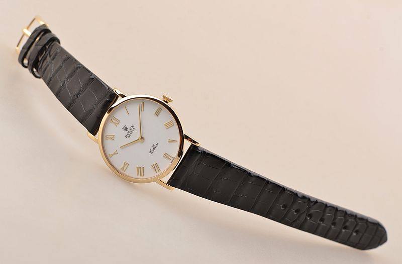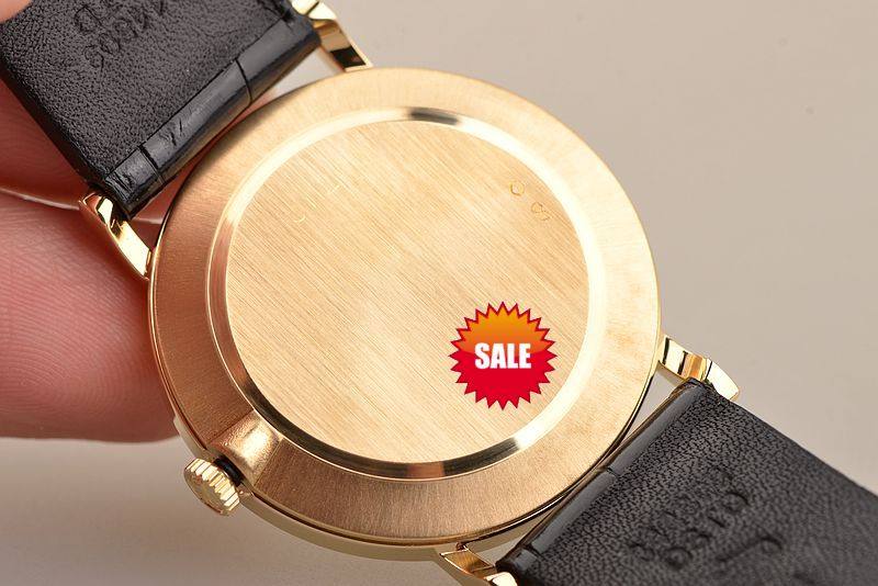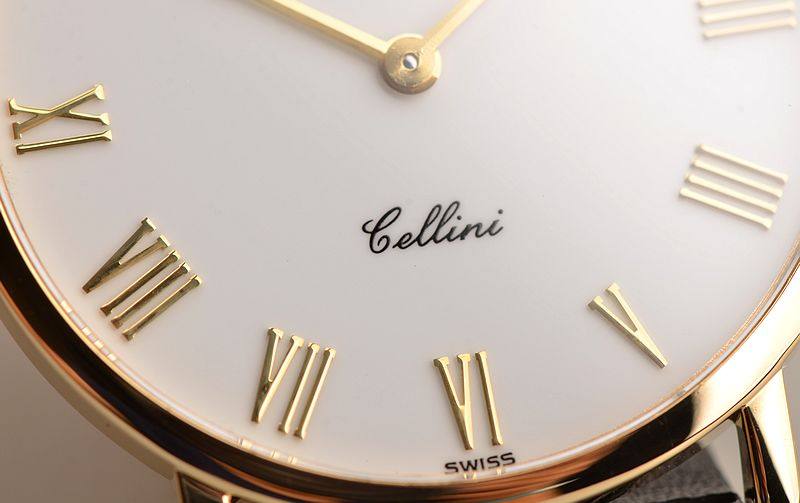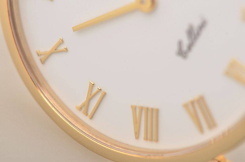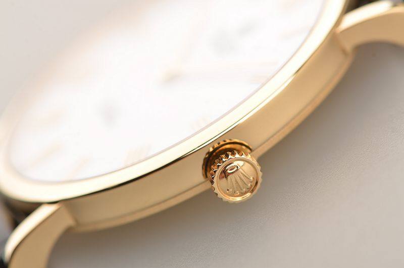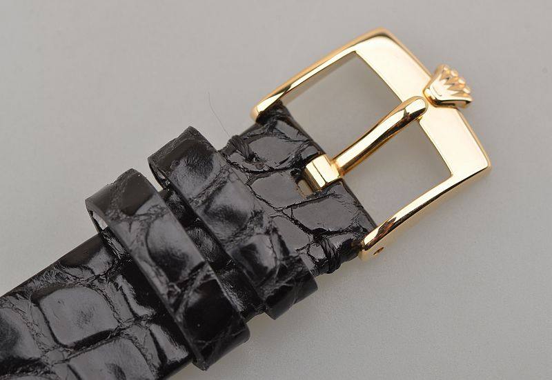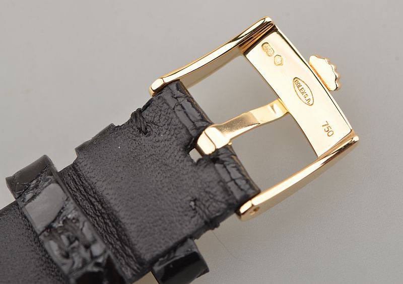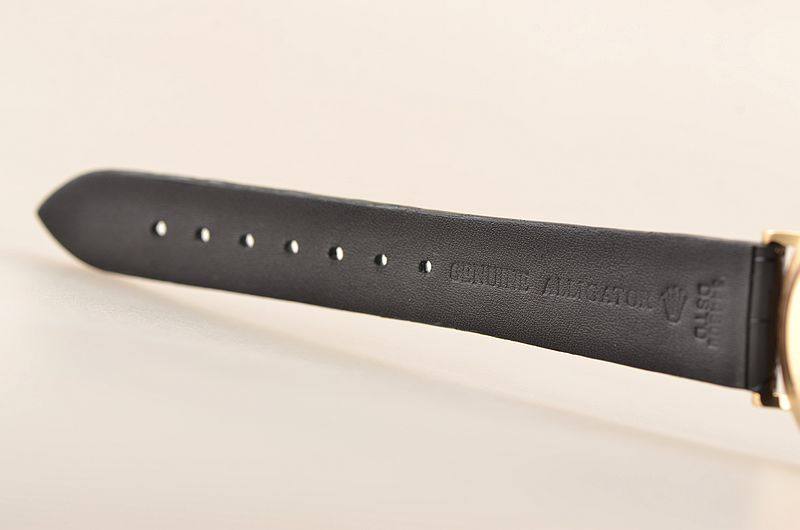 18K黄金表壳及表扣,圣伯纳狗头印记。后配全新亮光黑色圆纹鳄鱼皮表带。蓝宝石水晶镜面,立体白色低温仿瓷表盘,黄金罗马数字刻度及指针,口径32MM*5.7MM。防水30M。