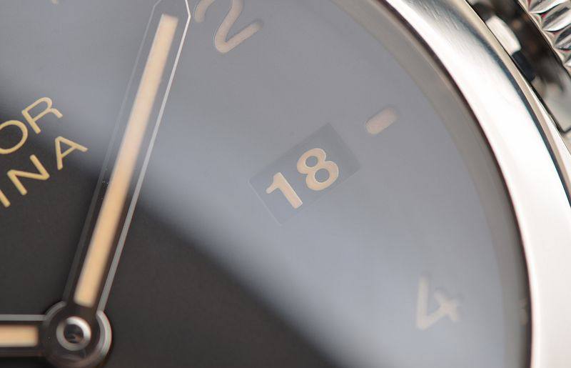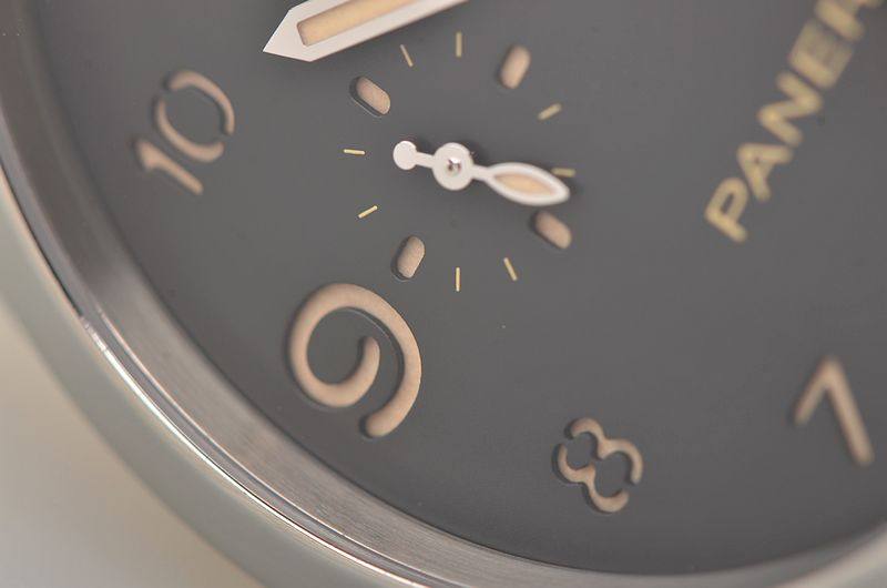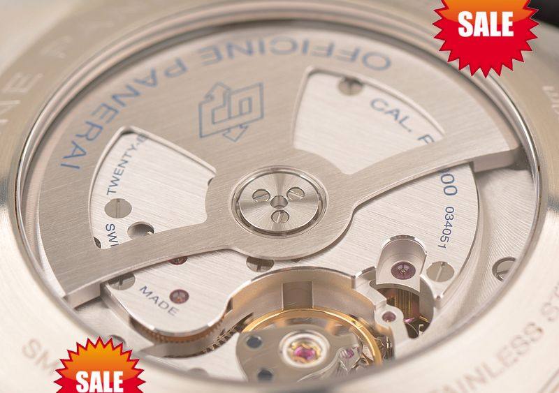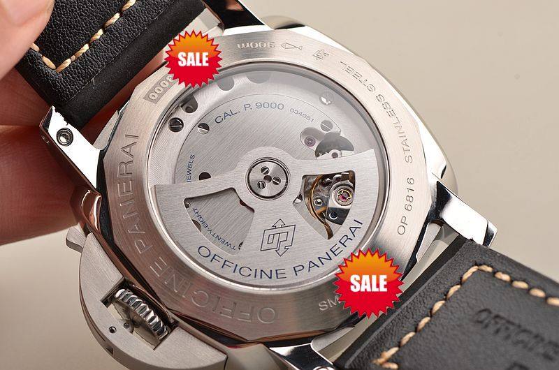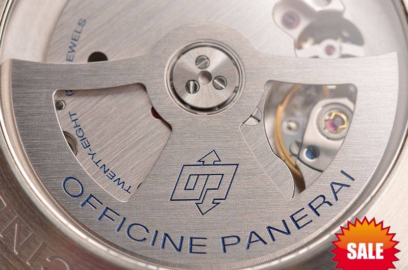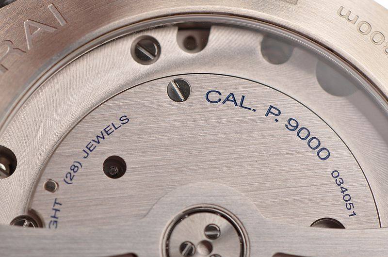沛纳海自产的CAL.P9000型机芯,自动机械,由195个零件组成,精致日内瓦条纹打磨,倒角抛光修饰。双发条盒,钯金属摆轮,28钻,摆频28800,动力储备约72小时,三天链。机芯有独立签署。走时状态极佳。