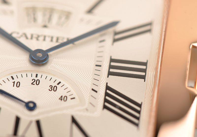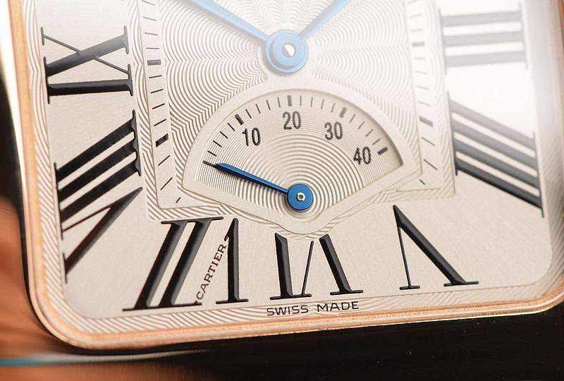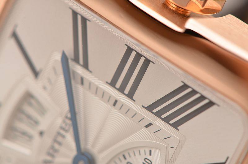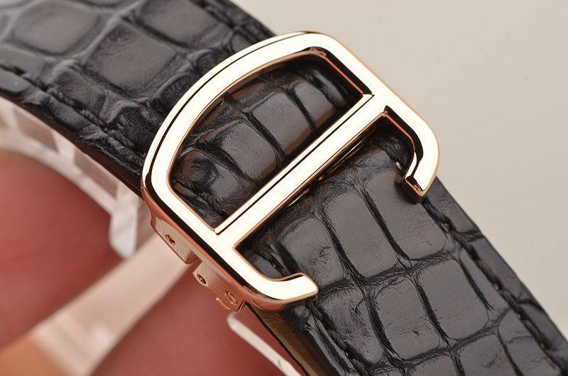 18K玫瑰金表壳及折叠式表扣,圣伯纳狗头印记。后配全新黑色鳄鱼皮表带。蓝宝石水晶镜面,立体银白色扭索纹表盘,黑色罗马刻度,蓝钢指针,12点位大日历显示功能,6点位指针式动储显示功能。口径47.4MM*38MM*9.3MM,相当于圆表