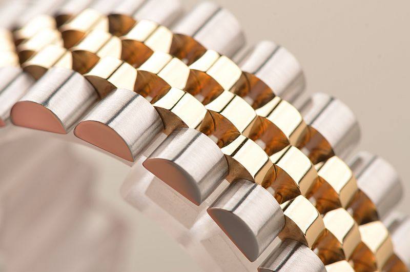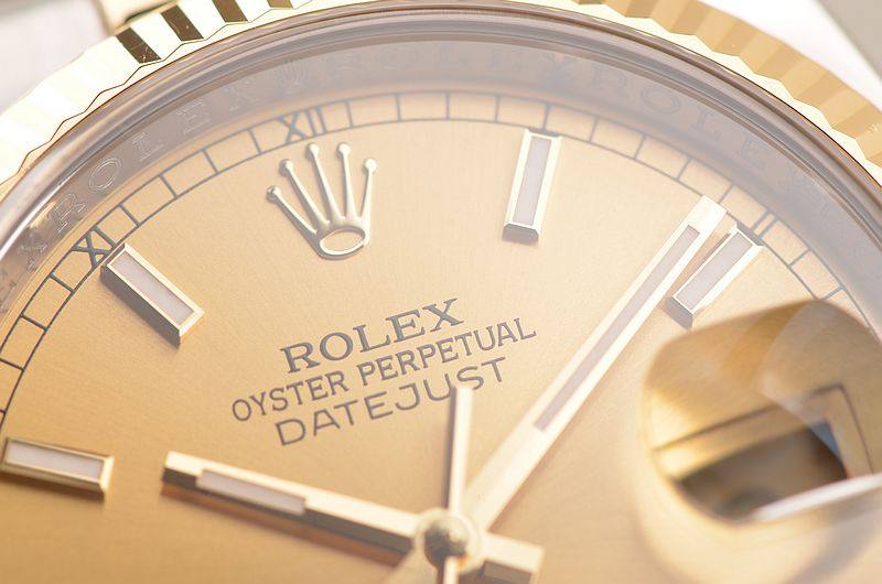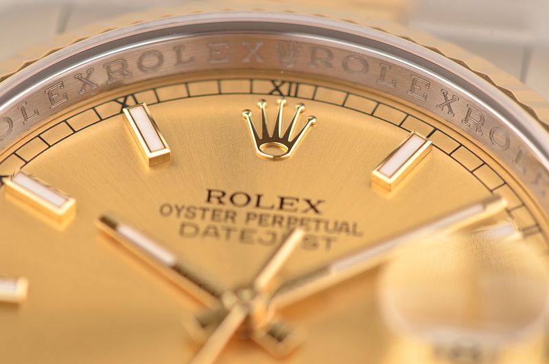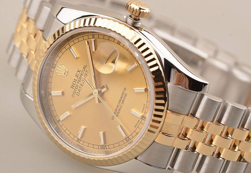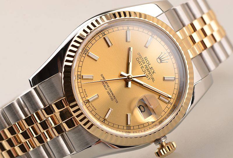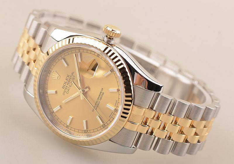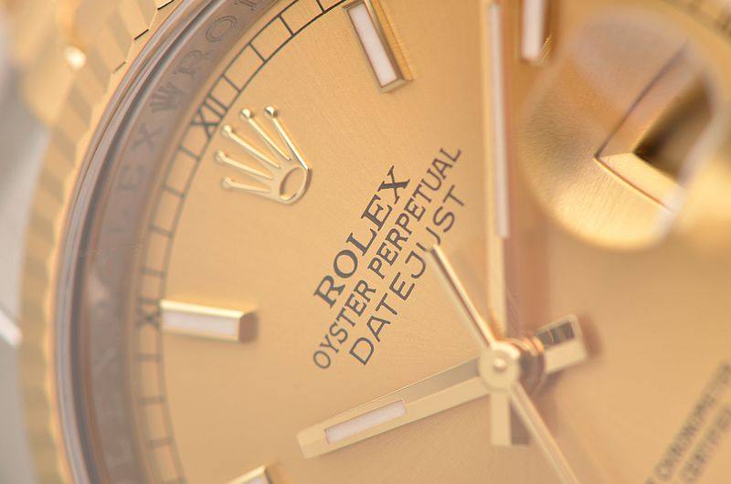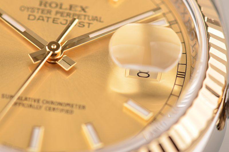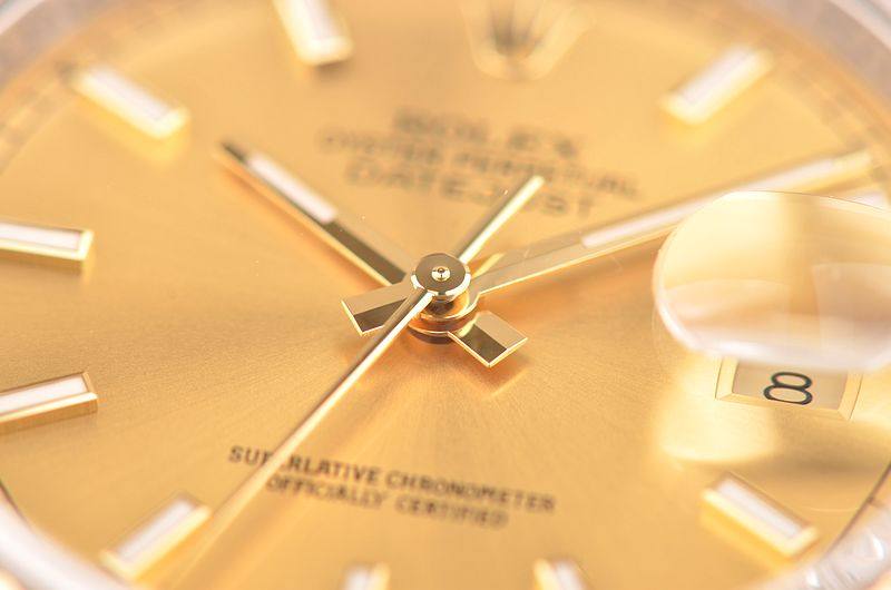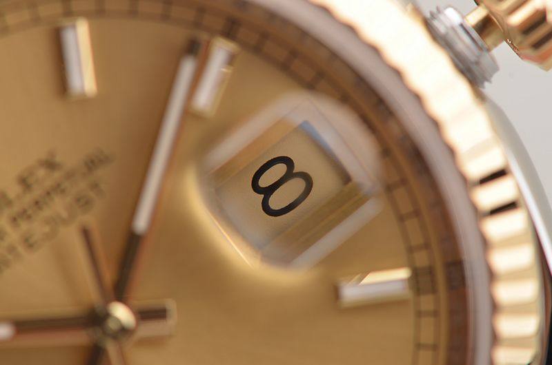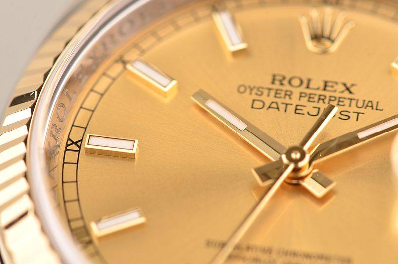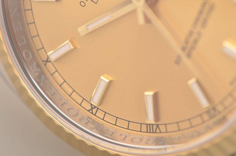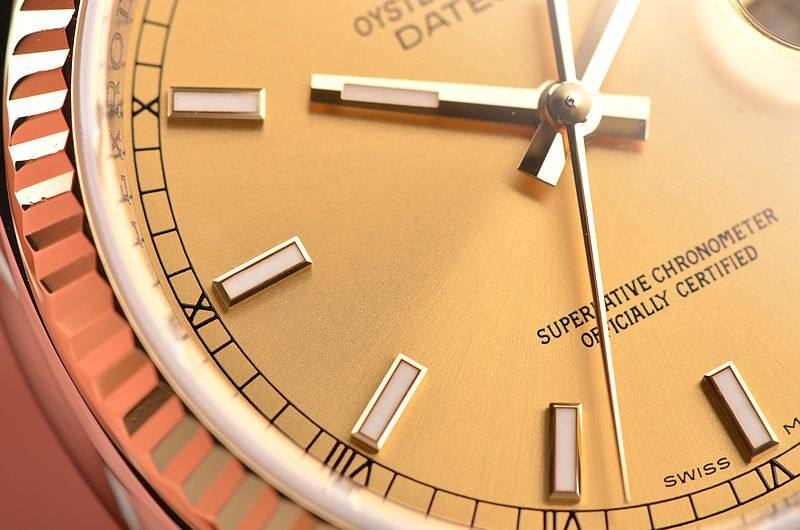 18K黄金及904L钢表壳及链带,折叠式表扣。18K黄金三角坑纹表圈,蓝宝石水晶镜面,最经典香槟金色表盘,黄金夜光指针及刻度。3点位放大镜日历显示。旋入式防水表冠。口径36MM*12MM,防水100M。
