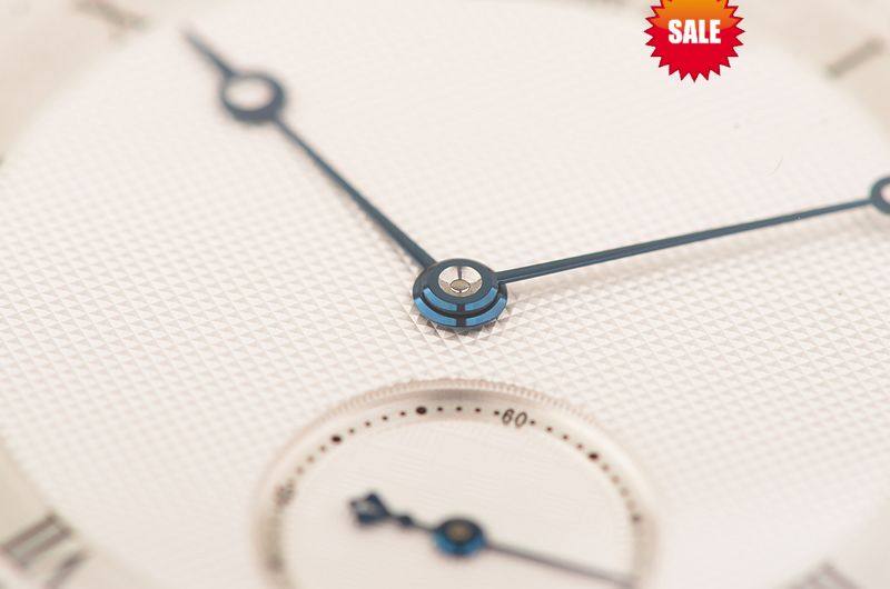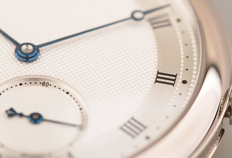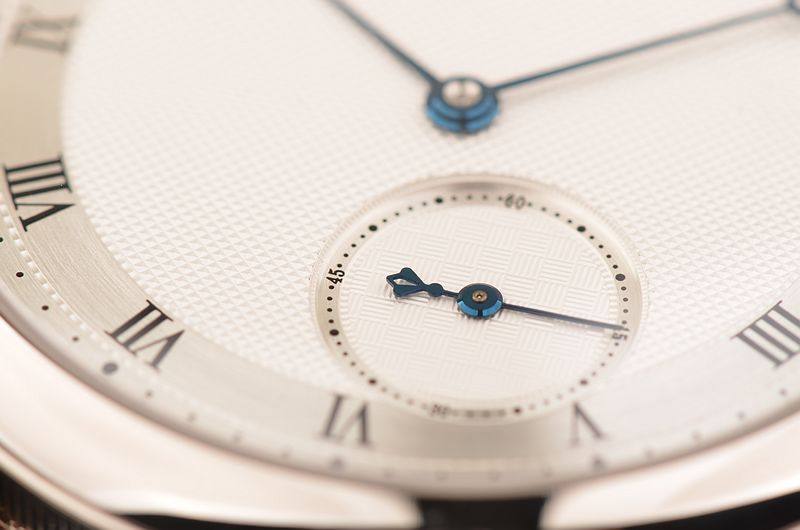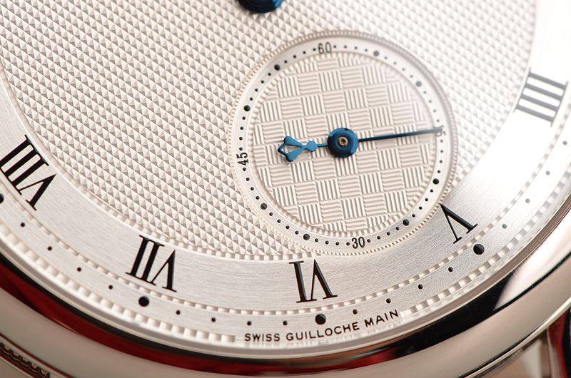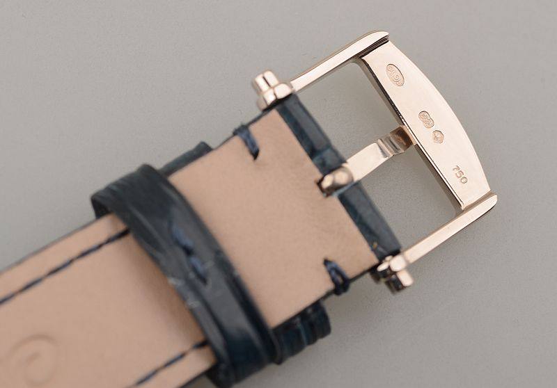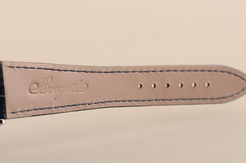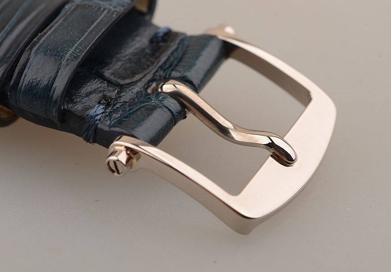 18K白金表壳及表扣,圣伯纳狗头印记。后配全新深蓝色鳄鱼皮表带。蓝宝石水晶镜面,手工镌刻立体镀银金表盘,蓝钢宝玑指针,小三针设计。口径40MM*10.8MM。防水30M。
