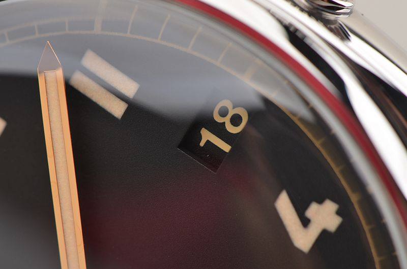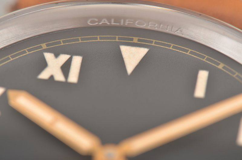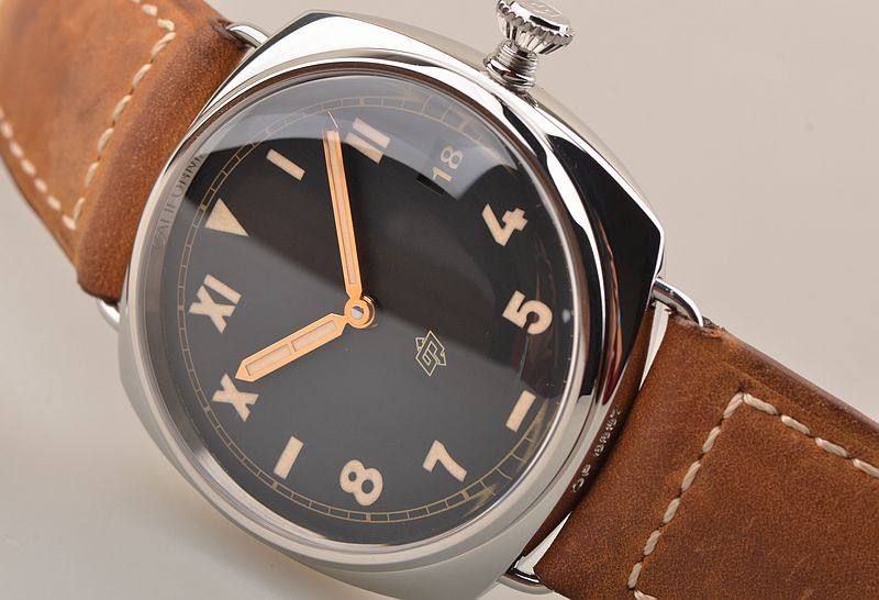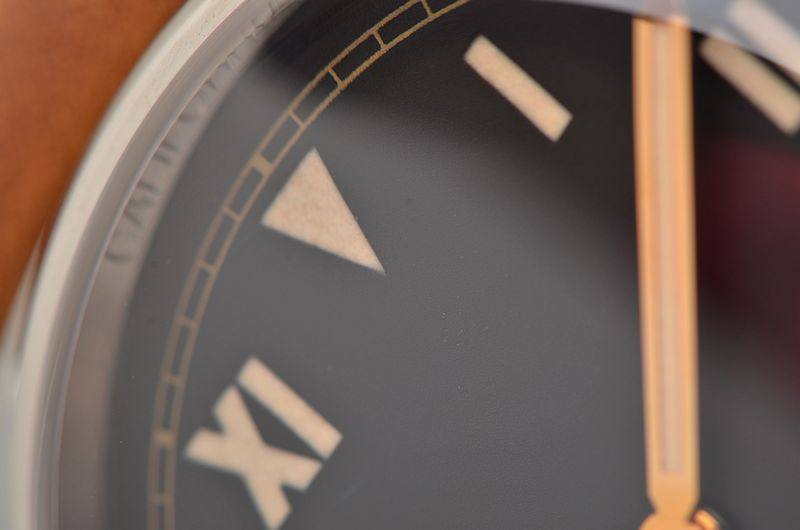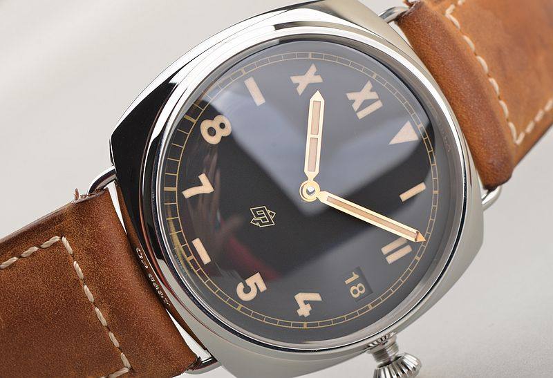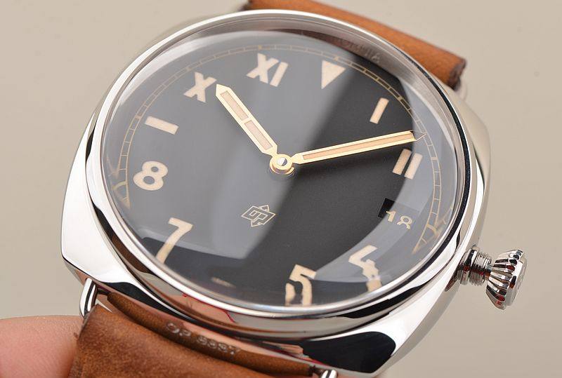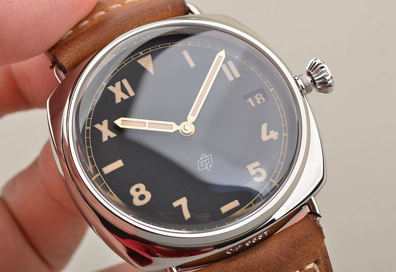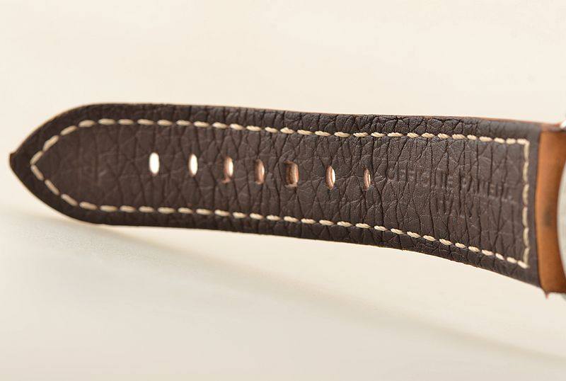 精钢表壳及表扣,原厂棕色水牛皮表带成色很新。由刚玉制成的蓝宝石水晶镜面及底盖,立体黑色加州面盘,复古黄夜光刻度及指针。3点位日历显示窗口。口径47MM*16MM。旋入式防水表冠,防水100M。