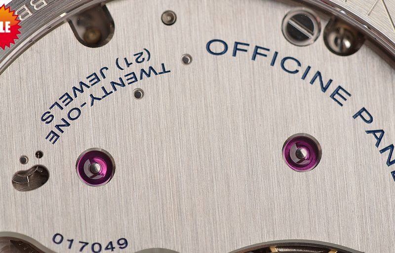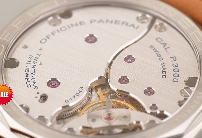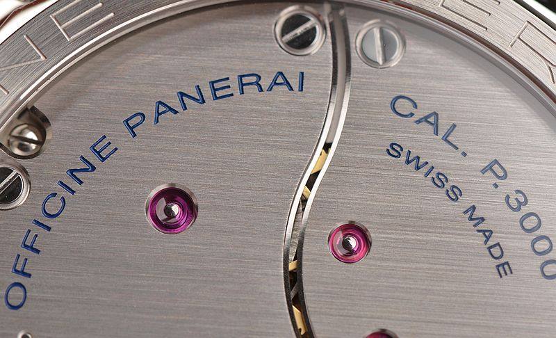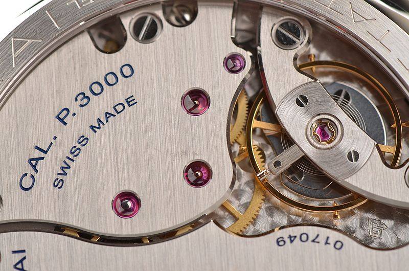 沛纳海自产的CAL.P3000型机芯,手动上链,双发条盒,Glucydur®平衡摆轮,Incabloc避震,由160个零件组成,极其精致日内瓦条纹及鱼鳞纹打磨,倒角抛光修饰,21钻,摆频21600,三天链。走时状态极佳。