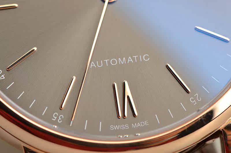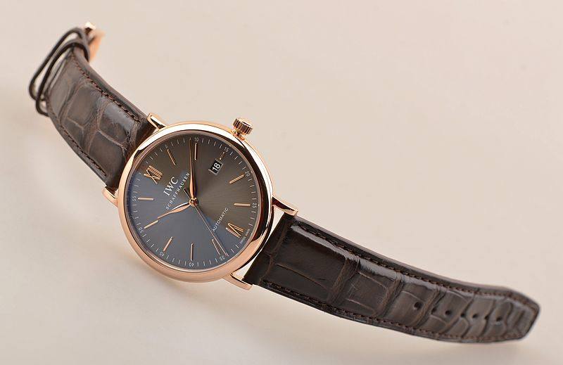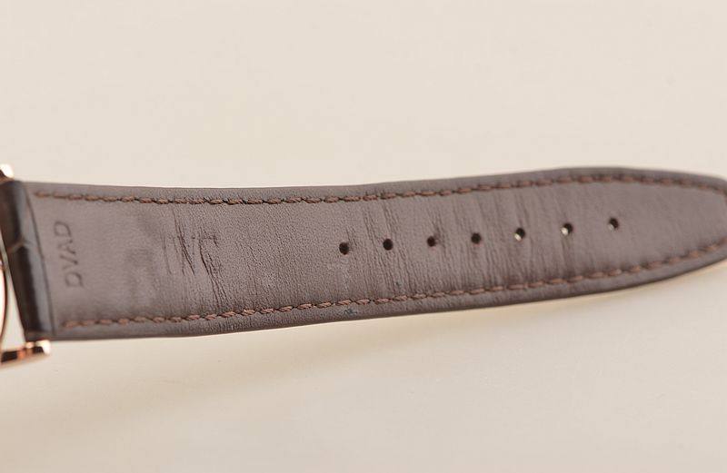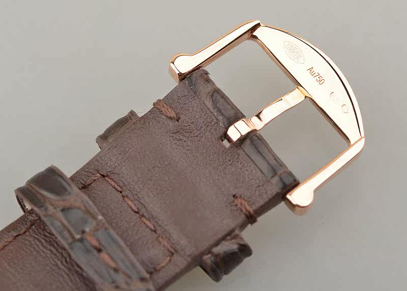 18K玫瑰金表壳及表扣,圣伯纳狗头印记。后配棕色短吻鳄鱼皮表带成色很新。蓝宝石水晶镜面,立体深灰色表盘,玫瑰金刻度及指针,12点位“红60刻度”。3点位日历显示功能。18K玫瑰金镌刻底盖(从Portofino港口眺望的城市景象)。口径40MM*9.5MM。防水30M。