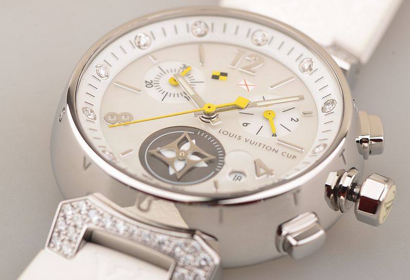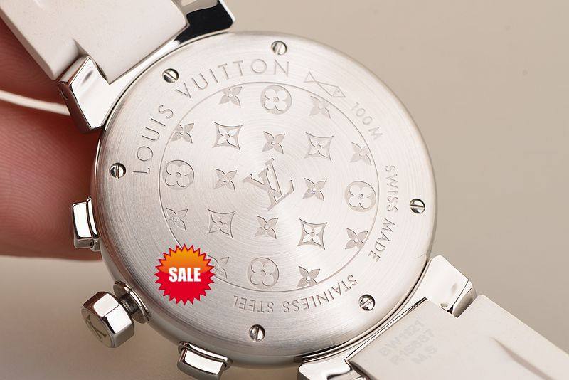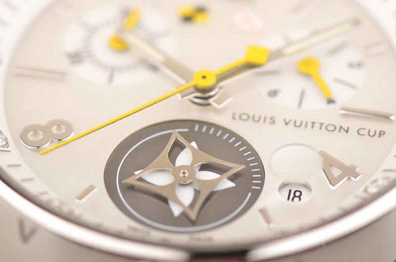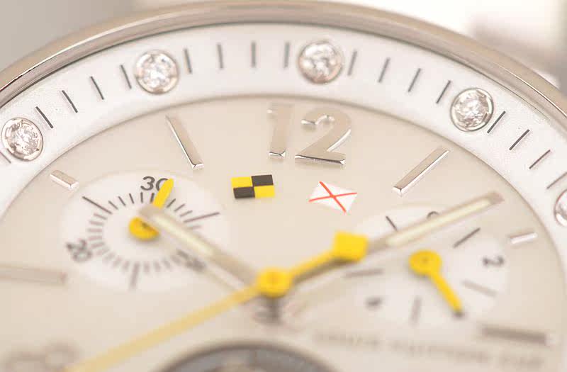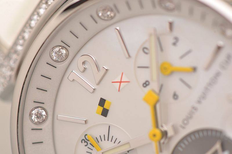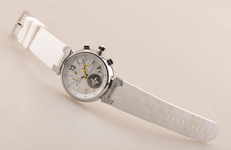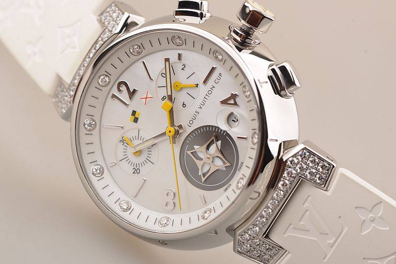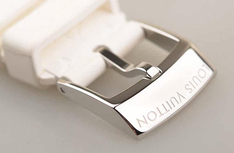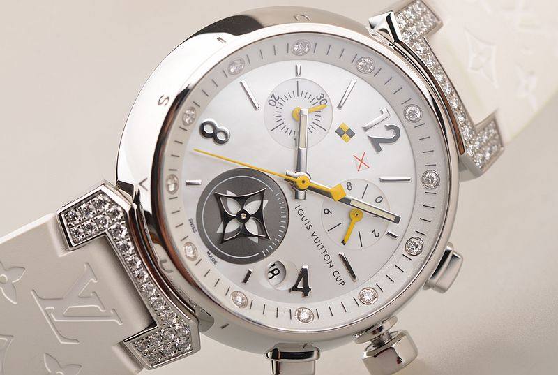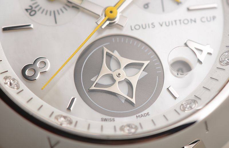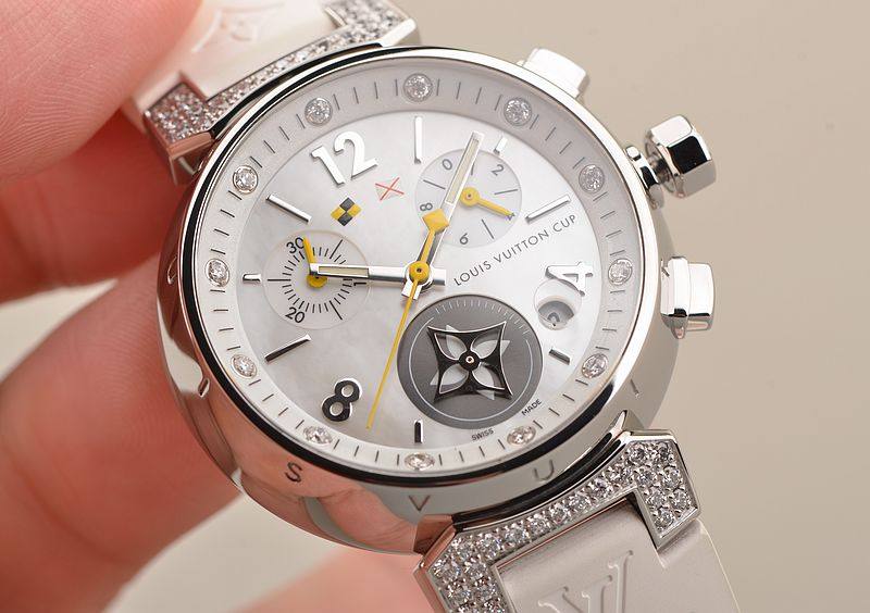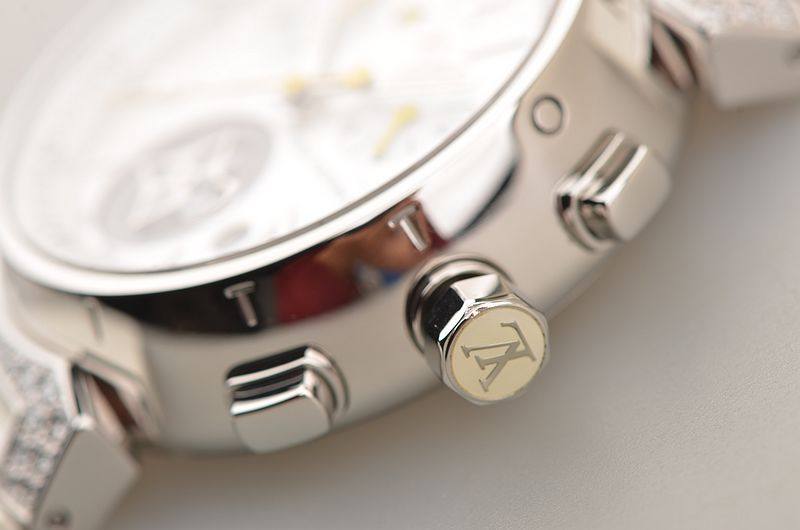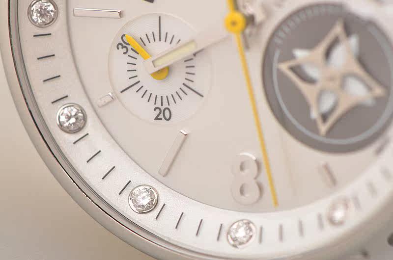 精钢表壳及表扣,表耳及表盘镶嵌共计54颗原厂顶级美钻(非后加钻,其中表耳42颗,表盘12颗,共计0.74克拉)。原厂白色路易威登Star Monogram花卉图案橡胶表带成色极新。蓝宝石水晶镜面,立体银白色珍珠贝母计时表盘,夜光时分针,10点位30分钟计时,2点位12小时计时,4至5点位间放大镜日历,6点位饰有Star Monogram花卉图案的独立小秒针。口径34MM*11.3MM。防水100M。