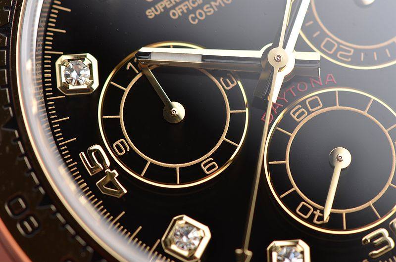 18K黄金及904L精钢表壳及链带,折叠式表扣。18K黄金测速表圈。蓝宝石水晶镜面,立体黑色计时表盘,黄金包钻刻度,夜光时分针,9点位12小时计时,6点位独立小秒针,3点位30分钟计时,旋入式防水表冠。口径40MM*12.3MM,防水100M。