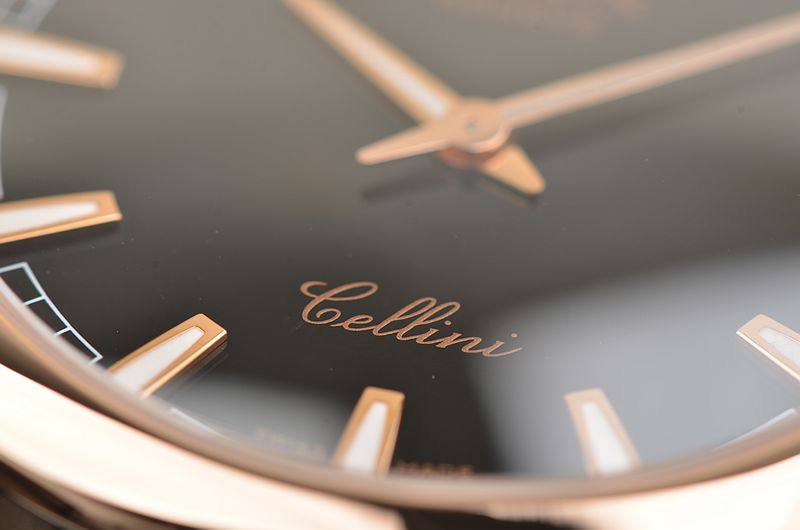 玫瑰金与白金双色表壳,白金折叠表扣。圣伯纳狗头印记。蓝宝石水晶镜面,立体黑色低温仿瓷面盘,玫瑰金夜光指针及刻度,口径38MM*46MM*7MM,相当于圆表40MM口径。属于切利尼最大号的表款。防水30M。