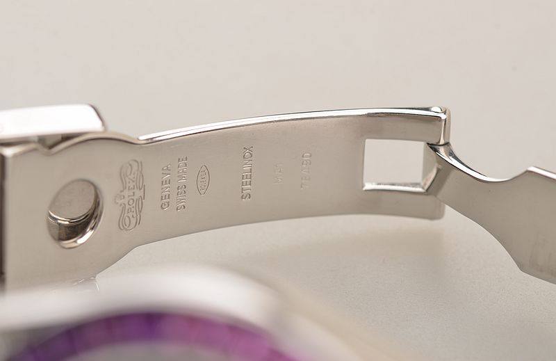 精钢表壳及链带,折叠式表扣。后镶彩色宝石钻圈,表耳密镶钻石。蓝宝石水晶镜面,立体黑色钻刻计时表盘,9点位12小时计时,6点位独立小秒针,3点位30分钟计时,旋入式防水表冠。口径40MM*13MM,防水100M。