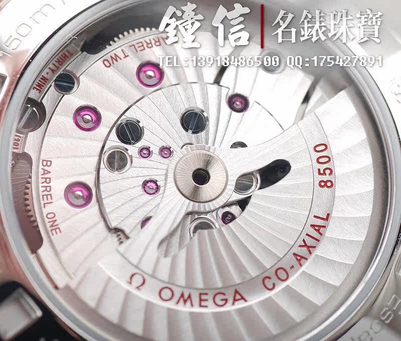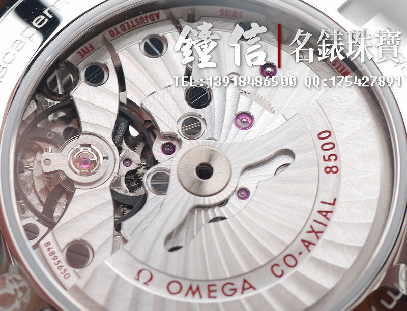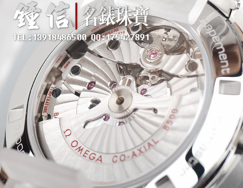 机 芯: 欧米茄8500,备有同轴擒纵装置的自动上链机芯,确保稳定持久的精准计时。无卡度游丝摆轮,双滚筒,双向自动上链,减少上链时间。桥板及摆动组件有阿拉伯式日内瓦波纹装饰。