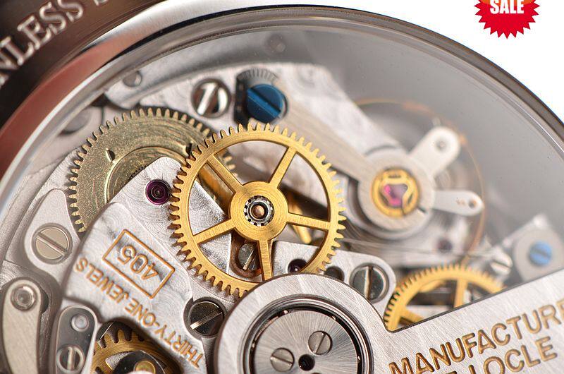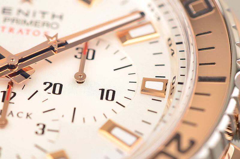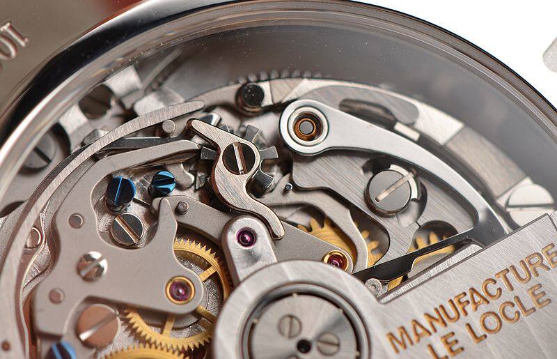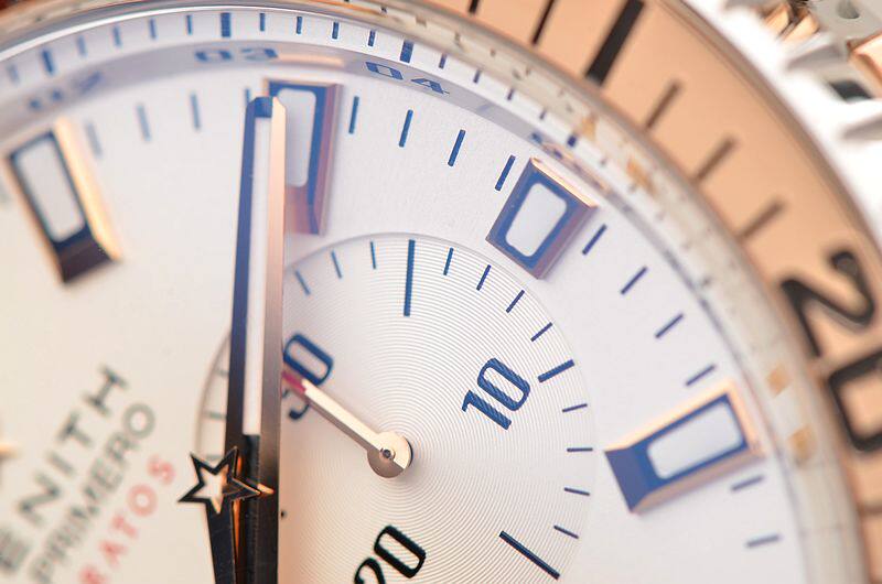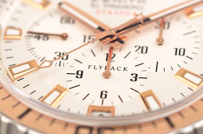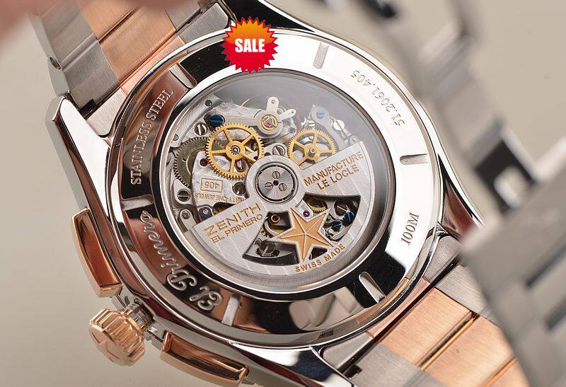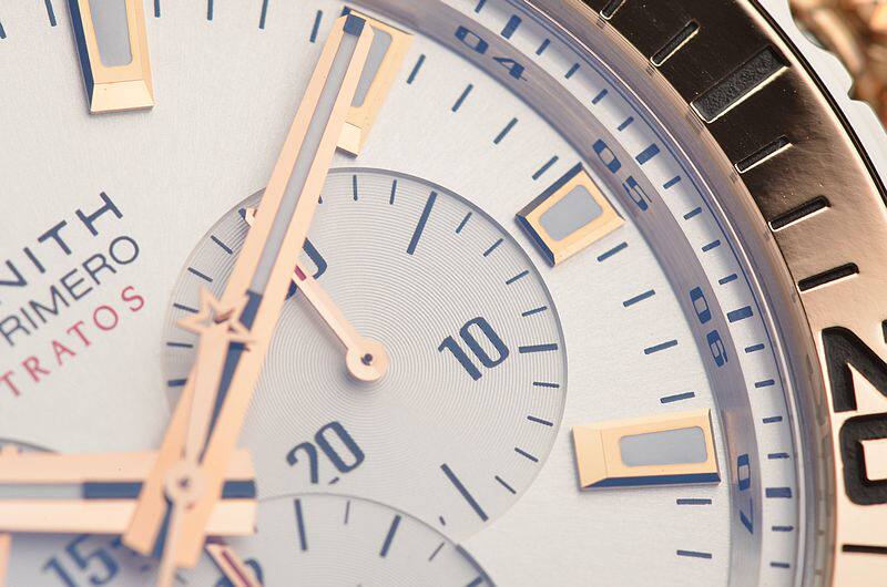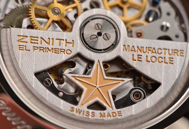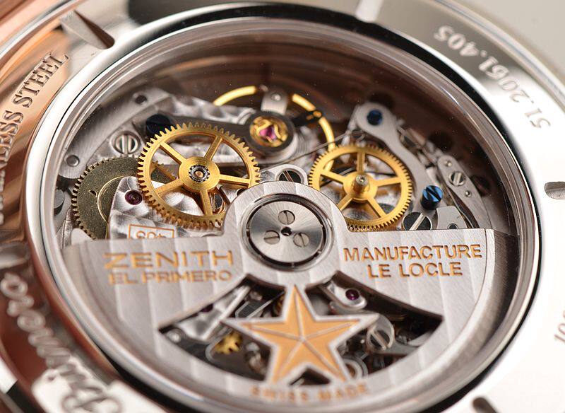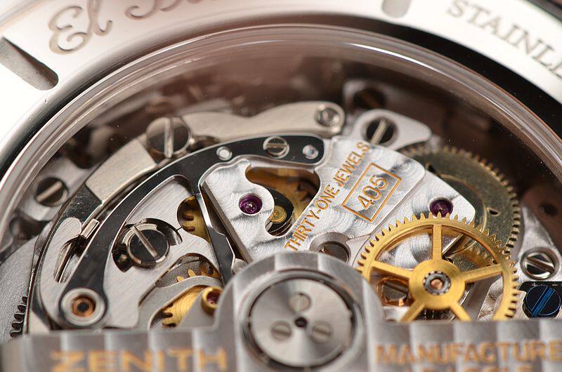 真力时自产的El Primero 405 B型机芯,自动机械,极其精致日内瓦条纹打磨,倒角抛光修饰。飞返计时及日历功能。由331个零件组成,31钻,摆频36000,高频计时码表,动力储备约50小时。走时状态极佳。