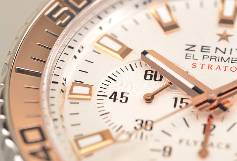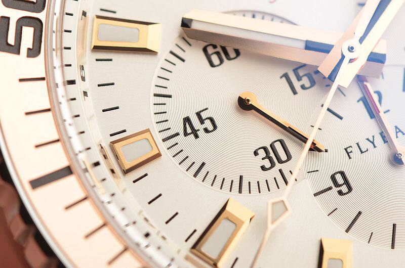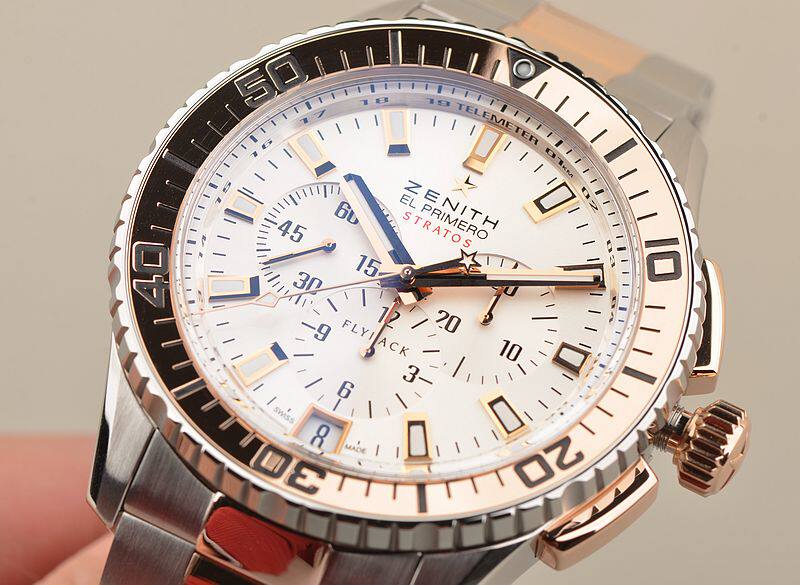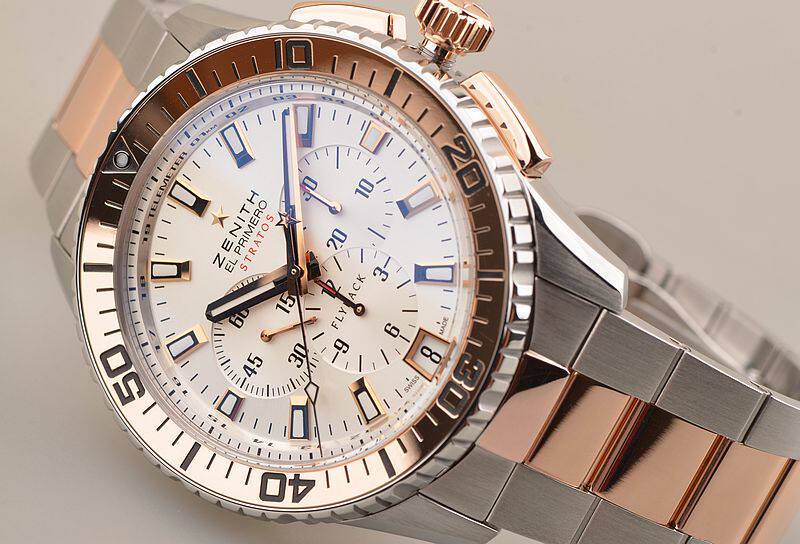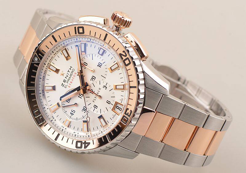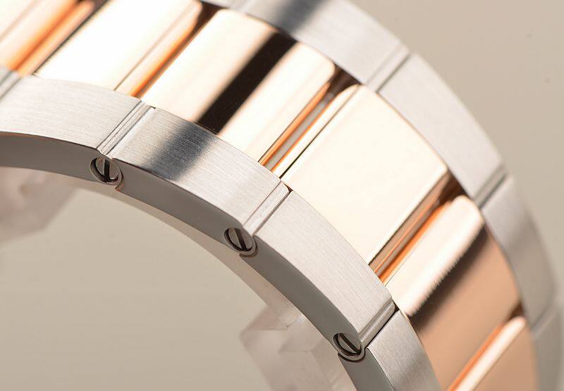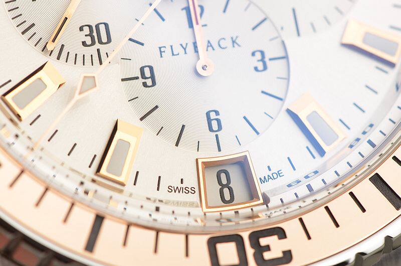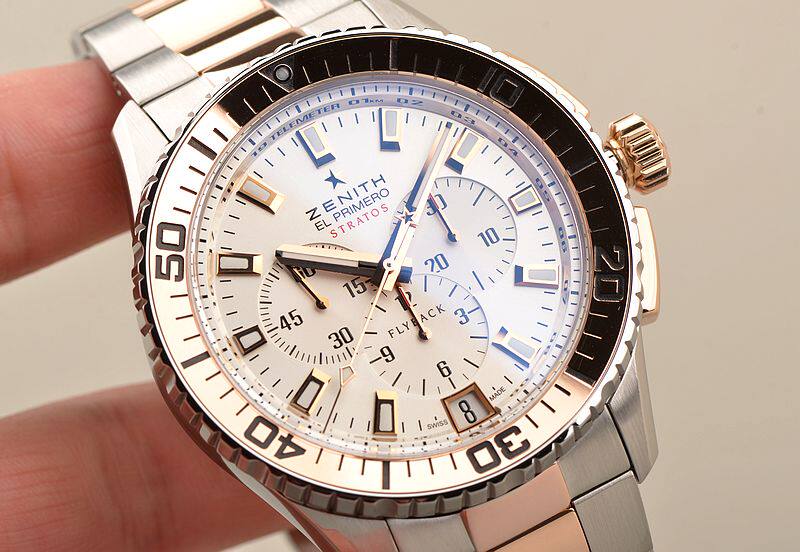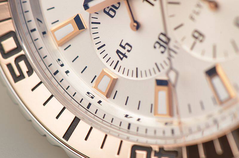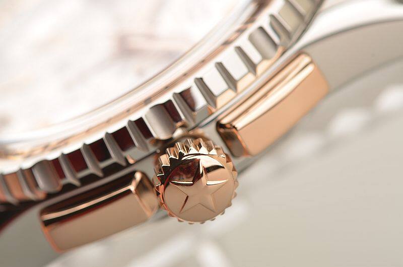 18K玫瑰金搭配精钢的表壳及链带,双向按压式折叠表扣。蓝宝石水晶镜面及底盖,玫瑰金单向可旋转计时表圈。立体白色计时表盘,金质夜光刻度及指针,9点位独立小秒针,6点位12小时计时圈,3点位30分钟计时圈,6点位日历显示窗口。口径45.5*14.1MM。属于男表中的大号尺寸。玫瑰金计时按钮及旋入式防水表把,防水100M。