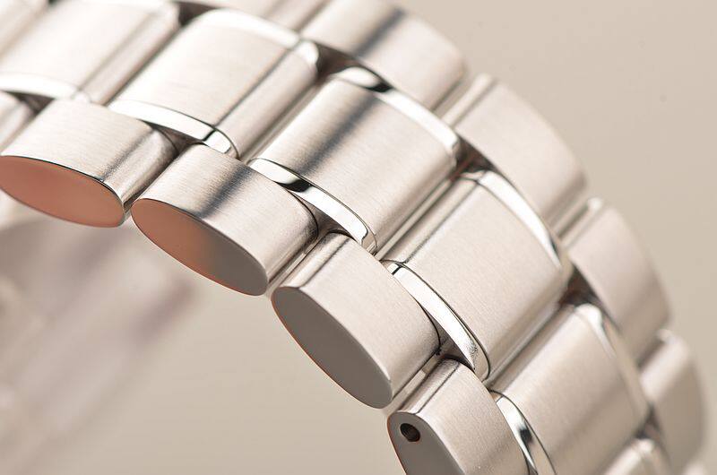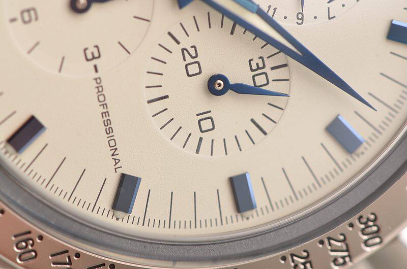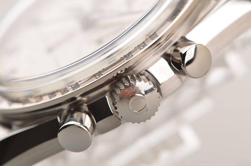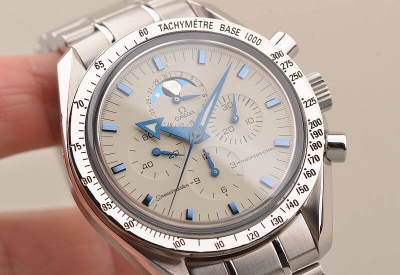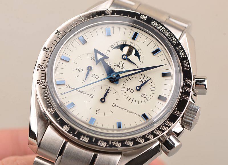 精钢表壳及链带,折叠式表扣。蓝宝石水晶镜面,立体白色计时表盘,测速表圈,蓝钢指针及刻度,时分针及刻度均有夜光显示功能。9点位独立小秒针,6点位12小时计时,3点位30分钟计时,12点位指针式日历及月相显示盘,口径42MM*14.3MM。防水100M。