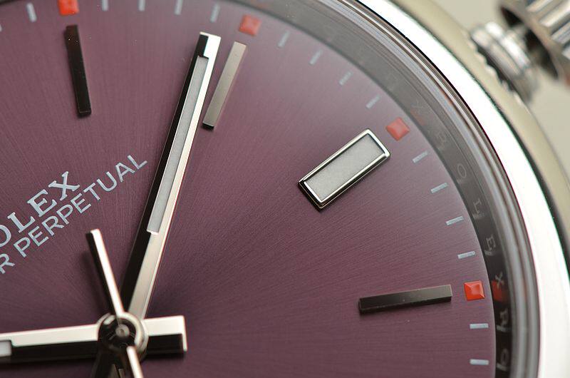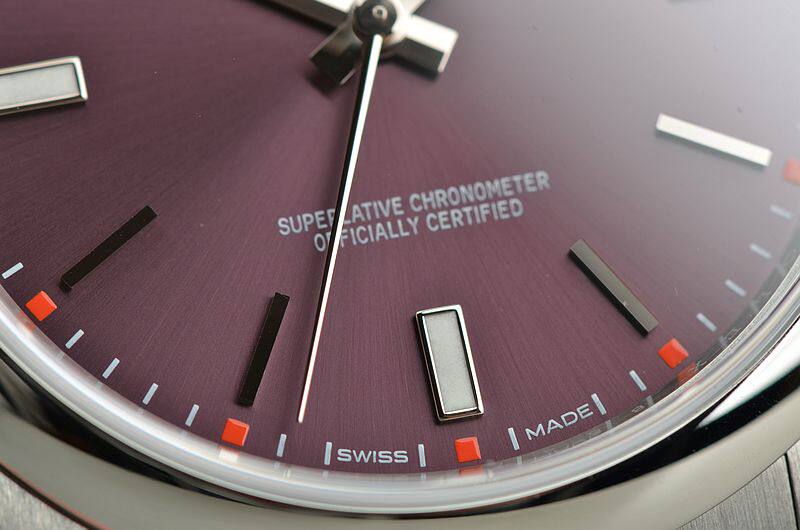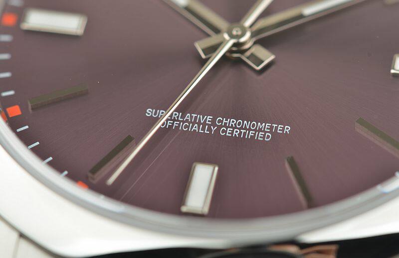 904L精钢表壳及链带,折叠式表扣。蓝宝石水晶镜面,立体紫色表盘(又称“紫葡萄”),天文台认证标示。夜光3、6、9位置时标及时分针。旋入式防水表把。口径39MM*11.3MM。男女合用款式。防水100M。