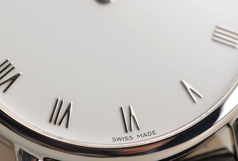 18K白金表壳,圣伯纳狗头印记。后配全新黑色鳄鱼皮表带。蓝宝石水晶镜面,立体白色表盘,白金罗马刻度及指针,口径34MM*5.4MM超薄厚度。中性表,男女皆可佩戴。防水30M。