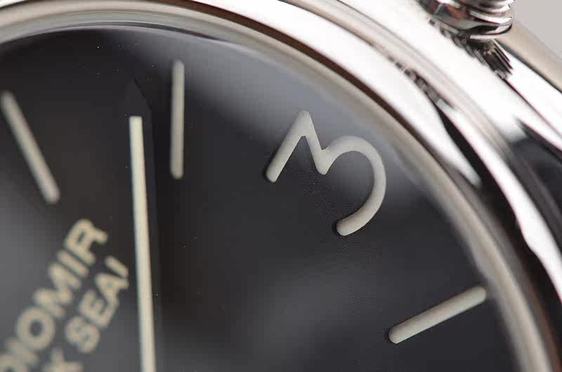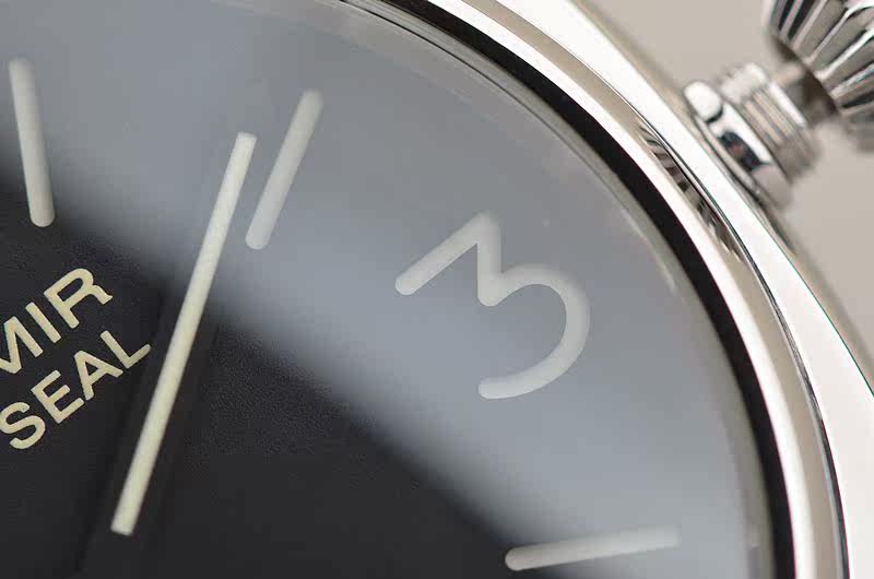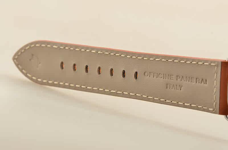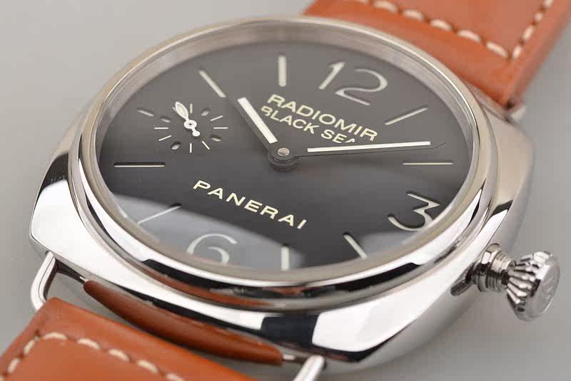 精钢表壳及表扣,后配全新棕色牛皮表带。弧形蓝宝石水晶镜面及底盖。黑色三明治表盘,夜光刻度及指针。口径45MM*13.5MM,旋入式防水表冠,防水100米。