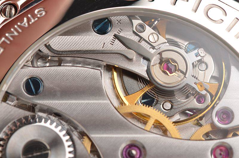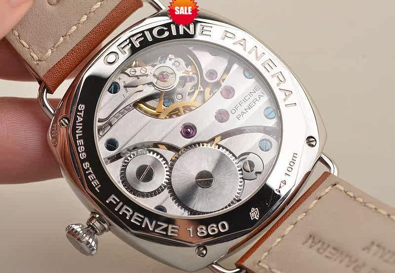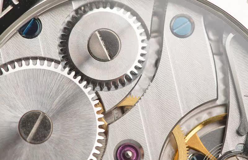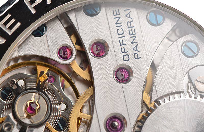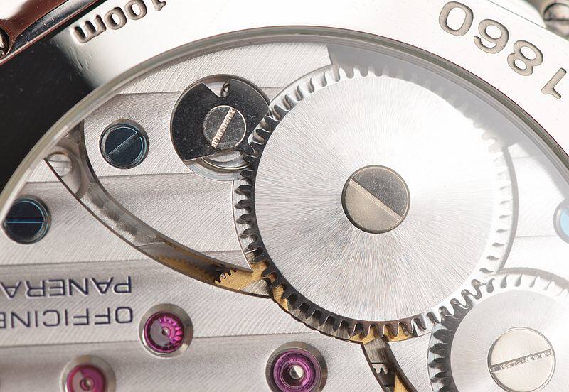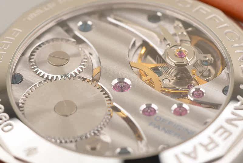沛纳海OPXI机芯,手动上链,精致的日内瓦条纹打磨及倒角抛光修饰。天文台认证,17钻,摆频21600。大夹板机芯,鹅颈微调功能。动力储存约56小时,走时状态极佳。