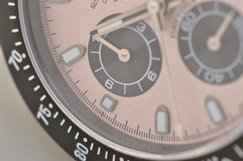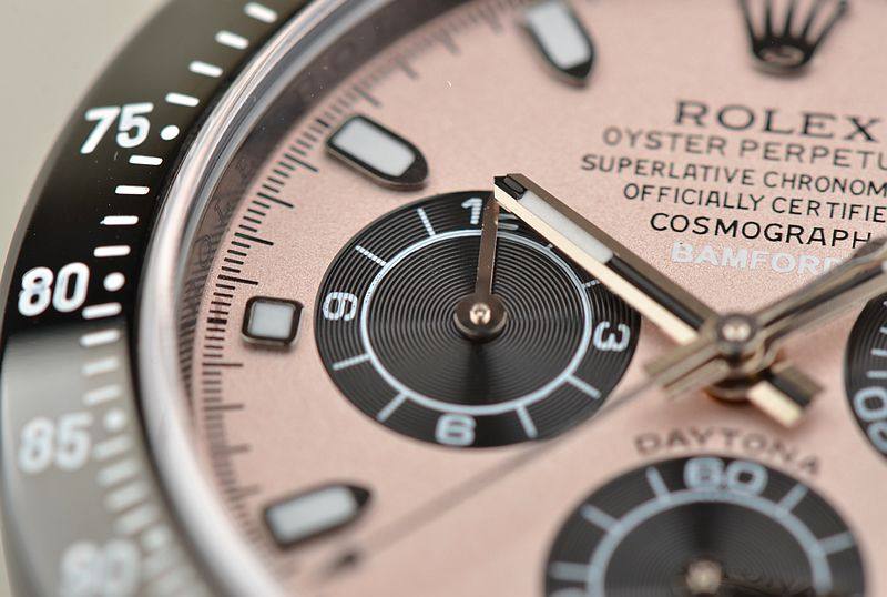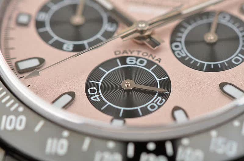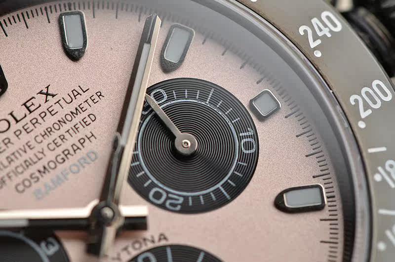 BAMFORD改装PVD涂层904L精钢表壳及链带,折叠式表扣,测速表圈。蓝宝石水晶镜面,改制立体浅粉色计时表盘(有BAMFORD签名),夜光刻度及时分针,9点位12小时计时,6点位独立小秒针,3点位30分钟计时,旋入式防水表冠。口径40MM*12MM,防水100M。