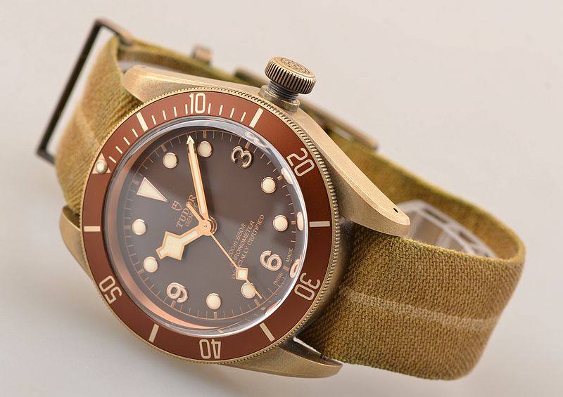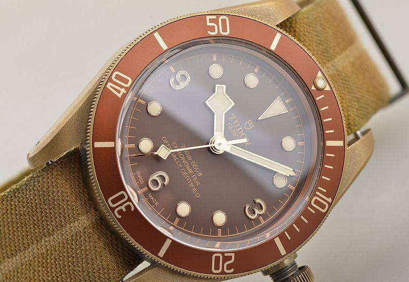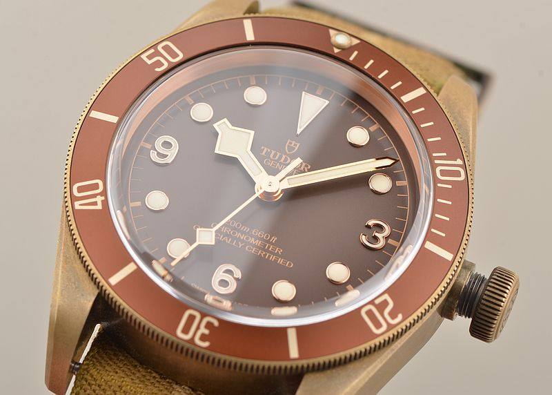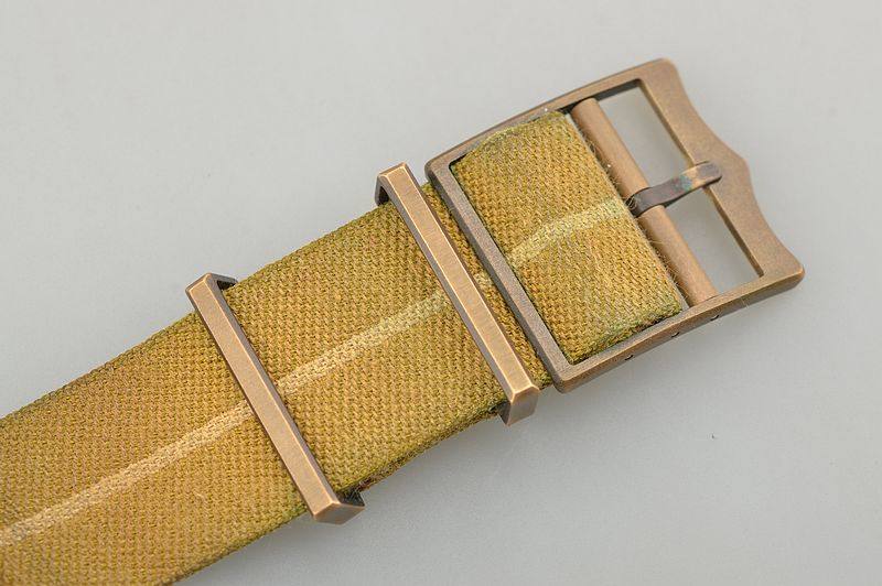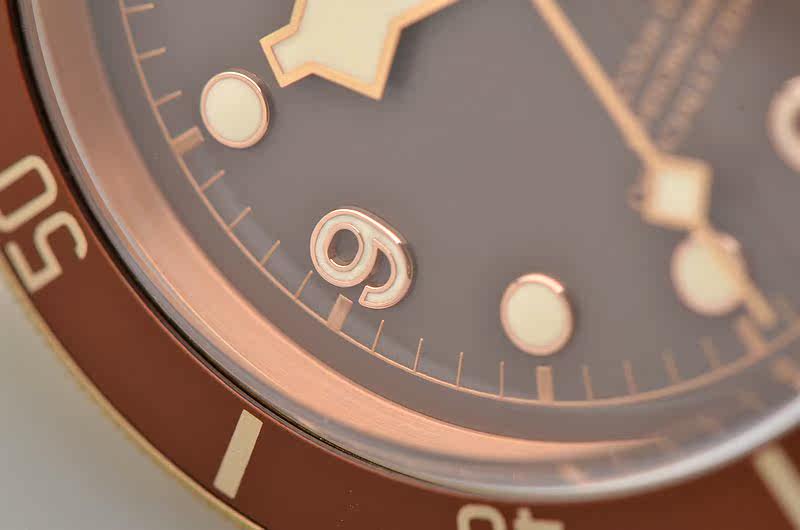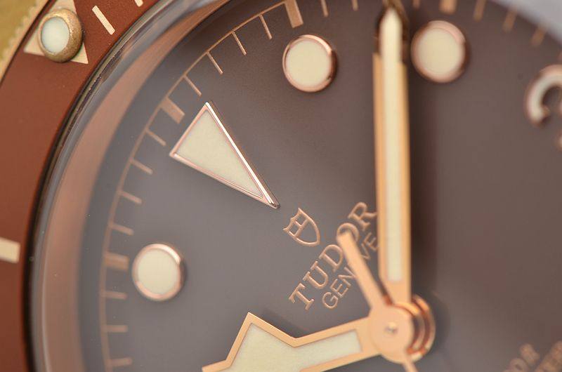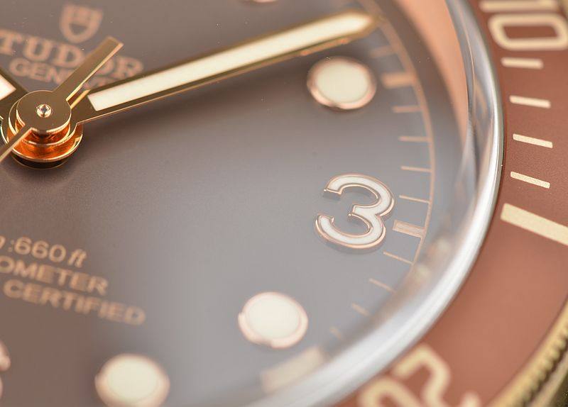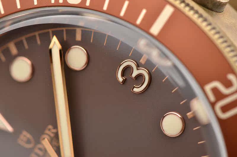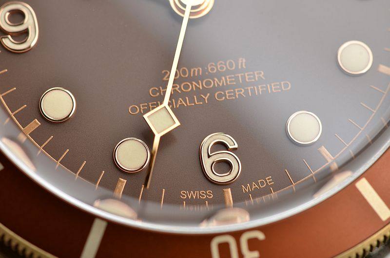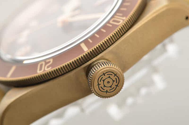 古铜色PVD磨砂精钢表壳及表扣,原厂古铜色尼龙表带成色较新,另有一条仿古棕色皮表带及表扣成色亦较新(共计两条原厂表带)。圆拱形蓝宝石水晶镜面,立体深棕色表盘,单向可旋转阳极氧化铝字计时外圈,夜光“雪花”指针及圆点刻度借鉴了品牌的传统美学。口径43MM*15.9MM。旋入式防水表把,防水200M。