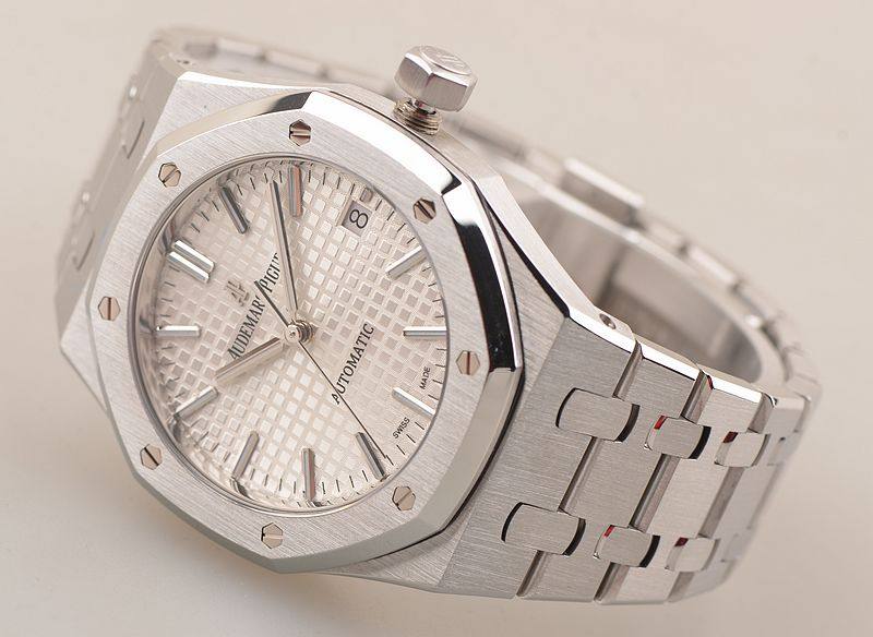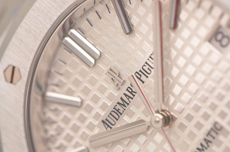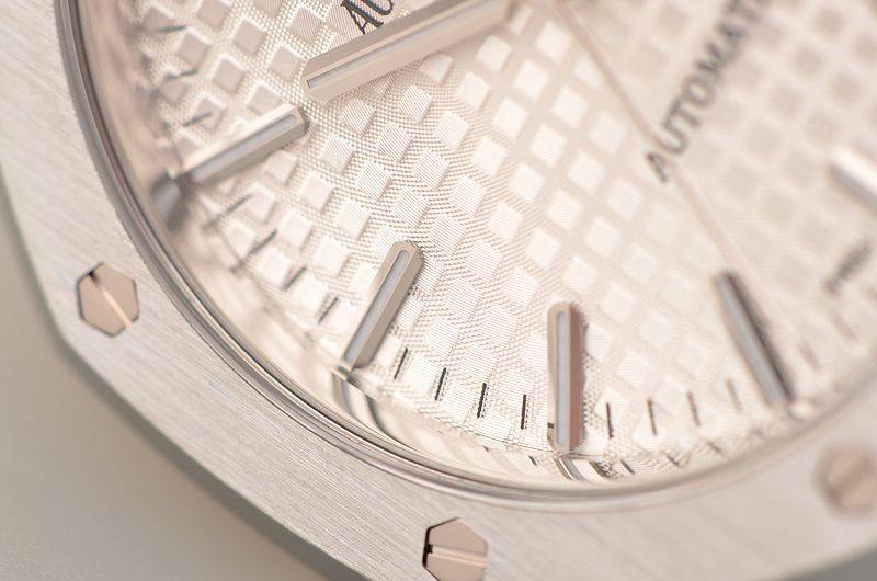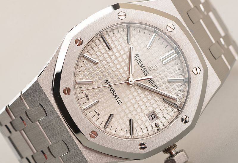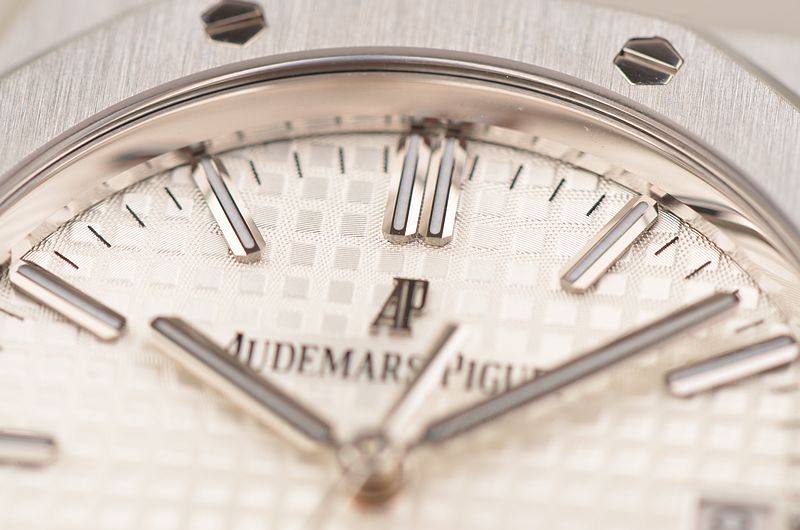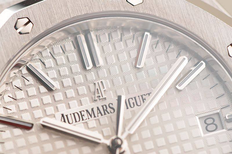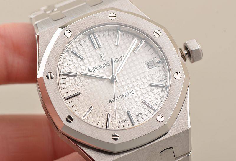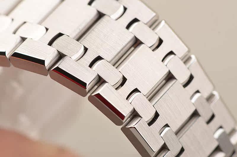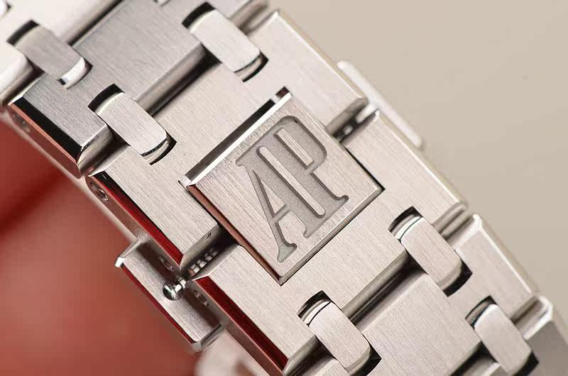 精钢八角皇家橡树表壳及链带,双向按压式折叠式表扣。前后盖白金螺丝,蓝宝石水晶镜面,立体银白色华夫格表盘,大三针设计。白金夜光刻度及指针,3点位日历显示。口径37MM*9.8MM。旋入式防水表冠。防水50M。