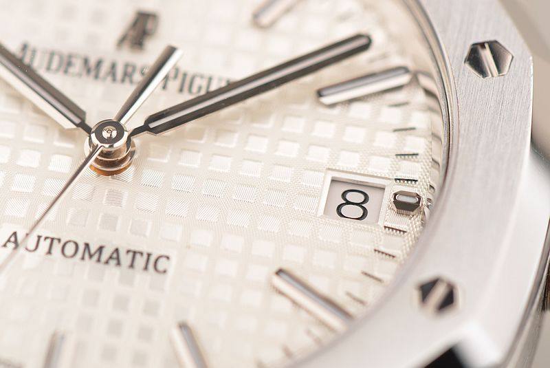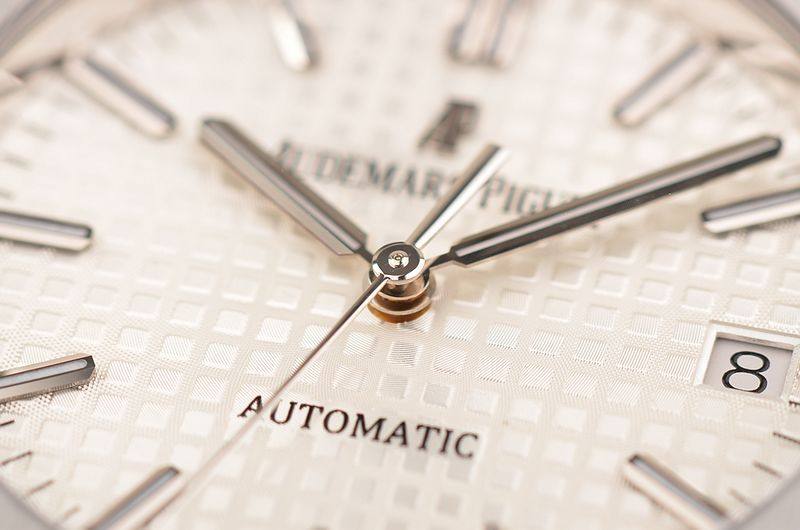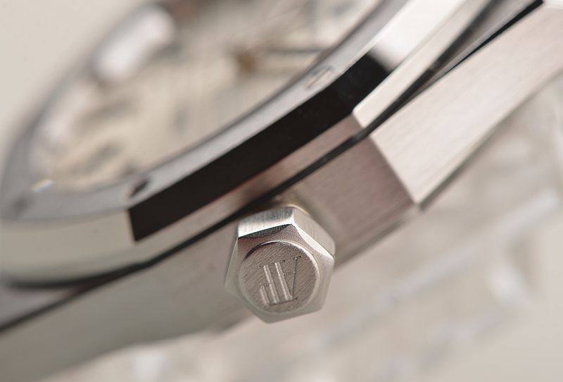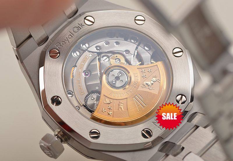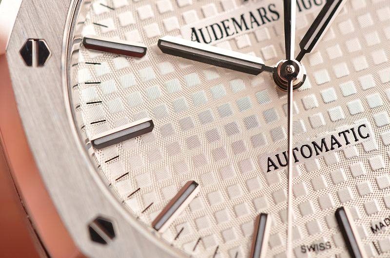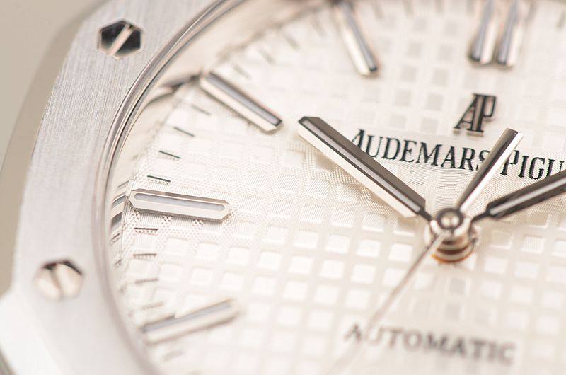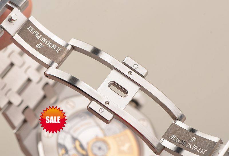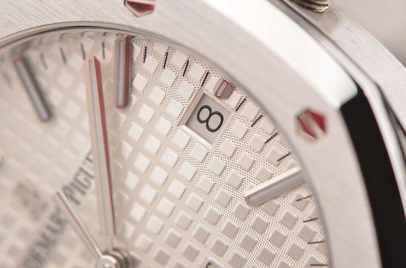 精钢八角皇家橡树表壳及链带,双向按压式折叠式表扣。前后盖白金螺丝,蓝宝石水晶镜面,立体银白色华夫格表盘,大三针设计。白金夜光刻度及指针,3点位日历显示。口径37MM*9.8MM。旋入式防水表冠。防水50M。