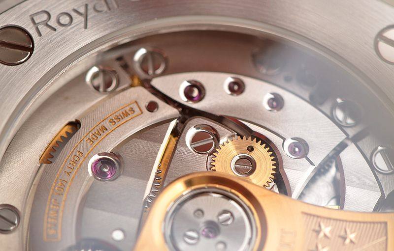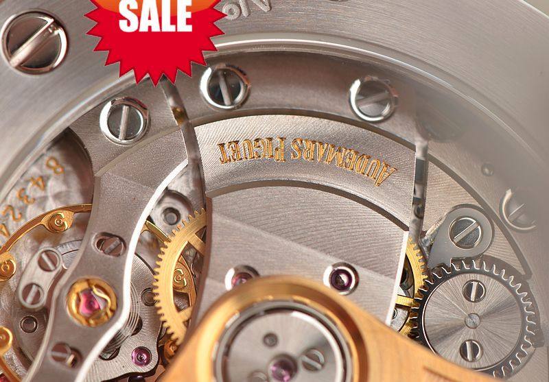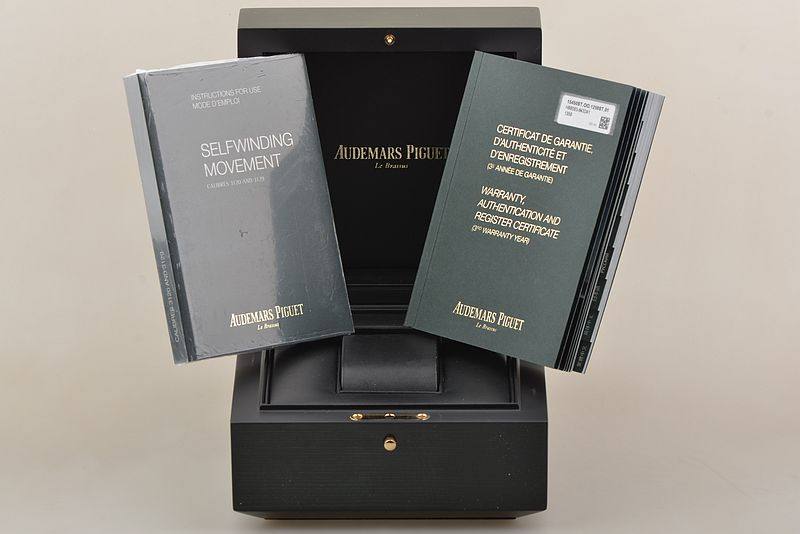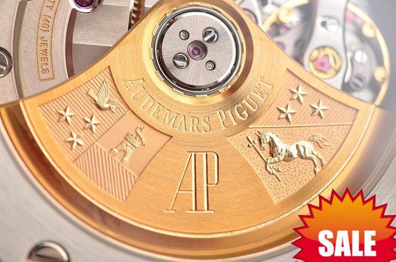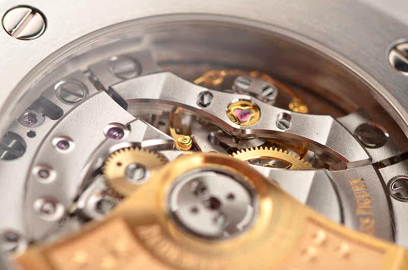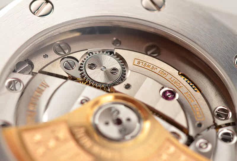 AP自产的CAL.3120型机芯,自动机械,由280个零件组成,极其精致日内瓦条纹打磨,倒角抛光修饰,陶瓷滚珠轴承中央自动盘,40钻,摆频21600,KIF避震器,22K黄金镌刻自动摆陀,动力储存约60小时,走时状态极佳。