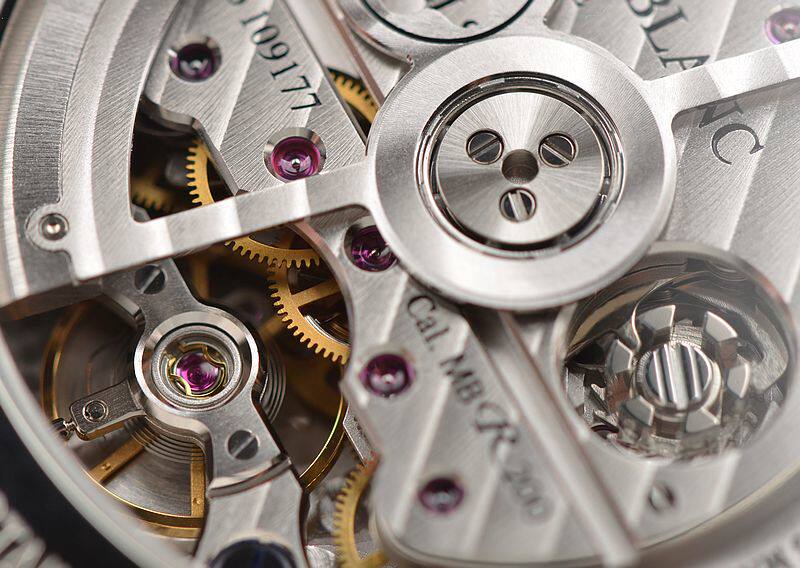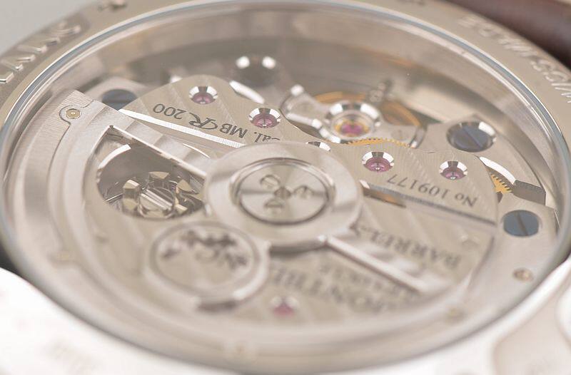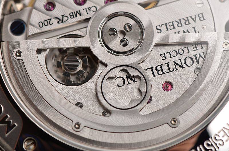 万宝龙自产的MB R200机芯,自动机械,40钻,摆频28800。动力储存约72小时,属于长动力机芯。5方位校正,导柱轮控制,纵向盘型离合器,平卷游丝,日内瓦条纹镀铑夹板。按个人手表方面的经验,这个机芯构造和打磨相当不错的。走时状态极嘉。